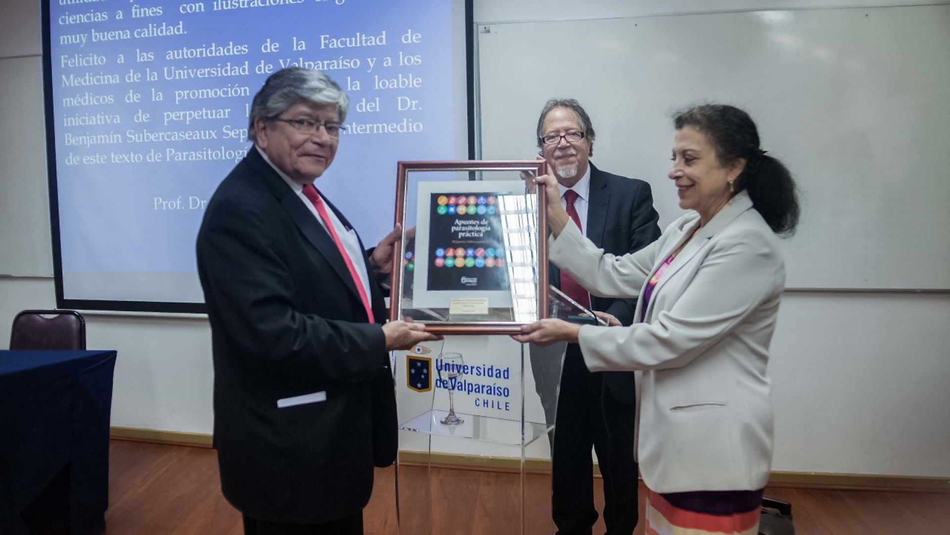Para testimoniar la culminación de la edición actualizada de “Apuntes de parasitología práctica”, la viuda y los hijos del autor, acompañados de sus amigos más cercanos, hicieron entrega oficial del libro a la Facultad de Medicina de la Universidad de Valparaíso, en cuyo nombre lo recibió el decano Antonio Orellana.