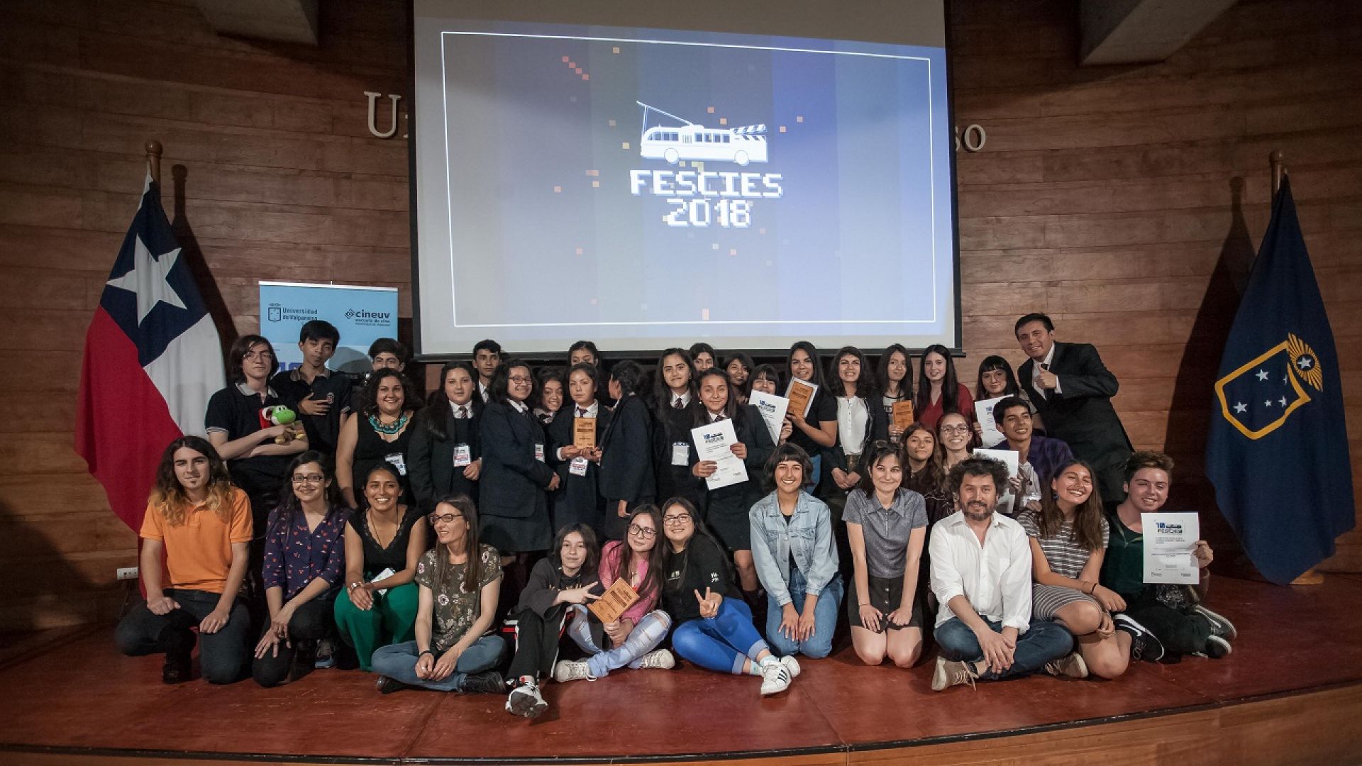 Con una ceremonia llena del entusiasmo adolescente característico, se realizó la premiación de la décima versión del Festival de Estudiantes Secundarios, FESCIES, en el auditorio de la Facultad de Arquitectura, en presencia de los propios alumnos y autoridades universitarias, como el director de Extensión y Comunicaciones UV, David Carrillo, y el director de la Escuela de Cine UV, Rodrigo Cepeda.