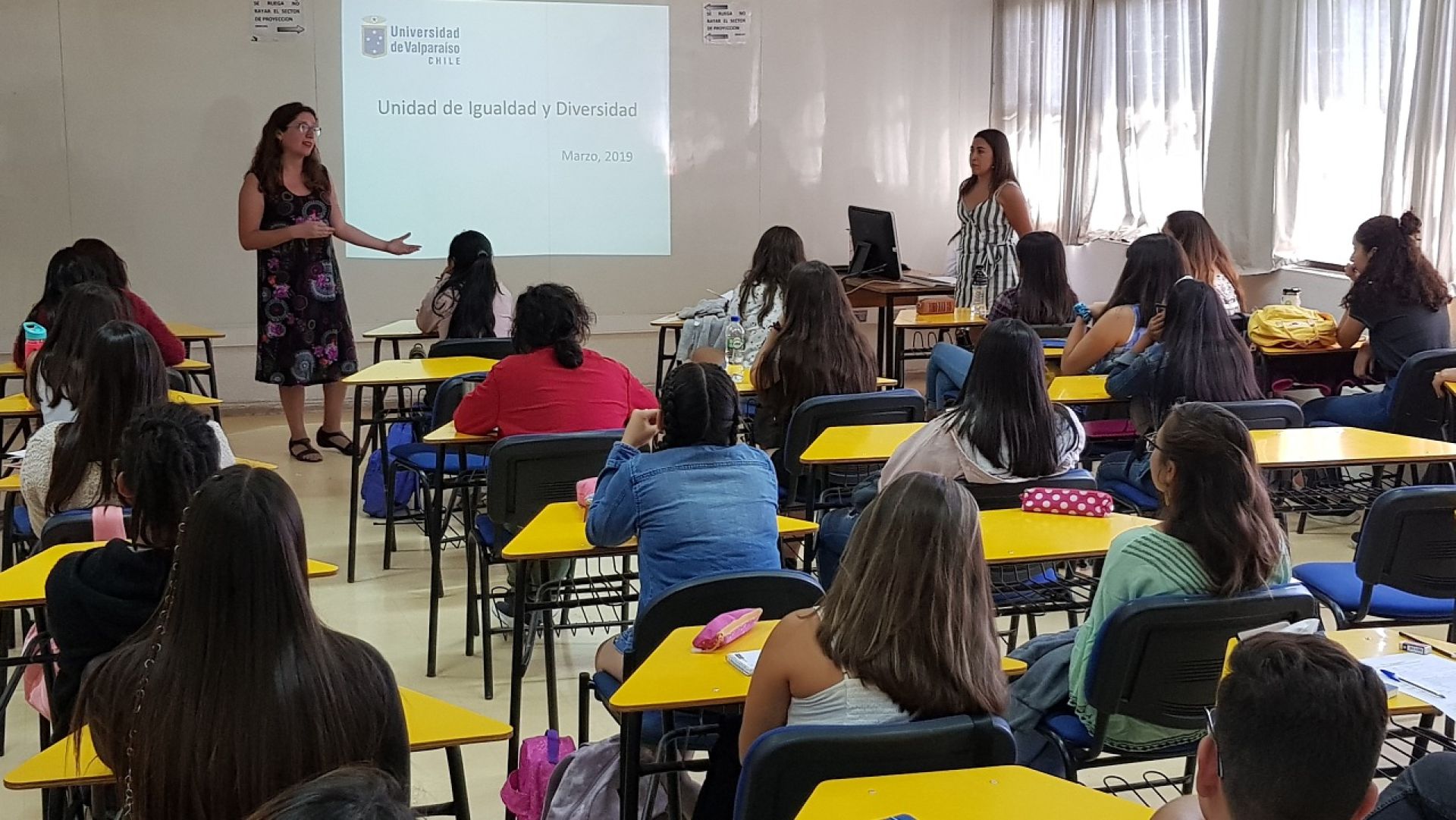 En el marco de la semana de inducción de los estudiantes de primer año, la encargada de la Unidad de Igualdad y Diversidad de la Universidad de Valparaíso, Daniela Marzi, visitó las dependencias del Campus San Felipe para compartir con los jóvenes que recién se incorporan a la casa de estudios y, de paso, socializar las políticas de prevención y sanción del acoso sexual y de toda discriminación por sexo, género y orientación sexual instauradas en el reglamento de la UV.
