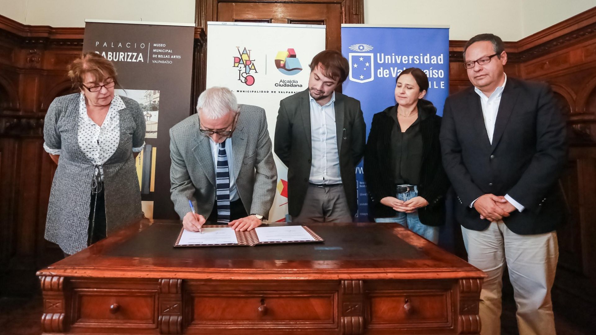 Este lunes se firmó el acuerdo que da base a la exposición, tras una reunión en la casa consistorial que fue encabezada por el alcalde de Valparaíso, Jorge Sharp, y el rector de la UV, Aldo Valle, y que contó con la participación de Macarena Carroza, directora de la Corporación Museo Baburizza; Eva Madrid, vicerrectora de Vinculación con el Medio de la UV; Rafael Torres, director del Museo, y David Carrillo, director de Extensión y Comunicaciones de la UV.