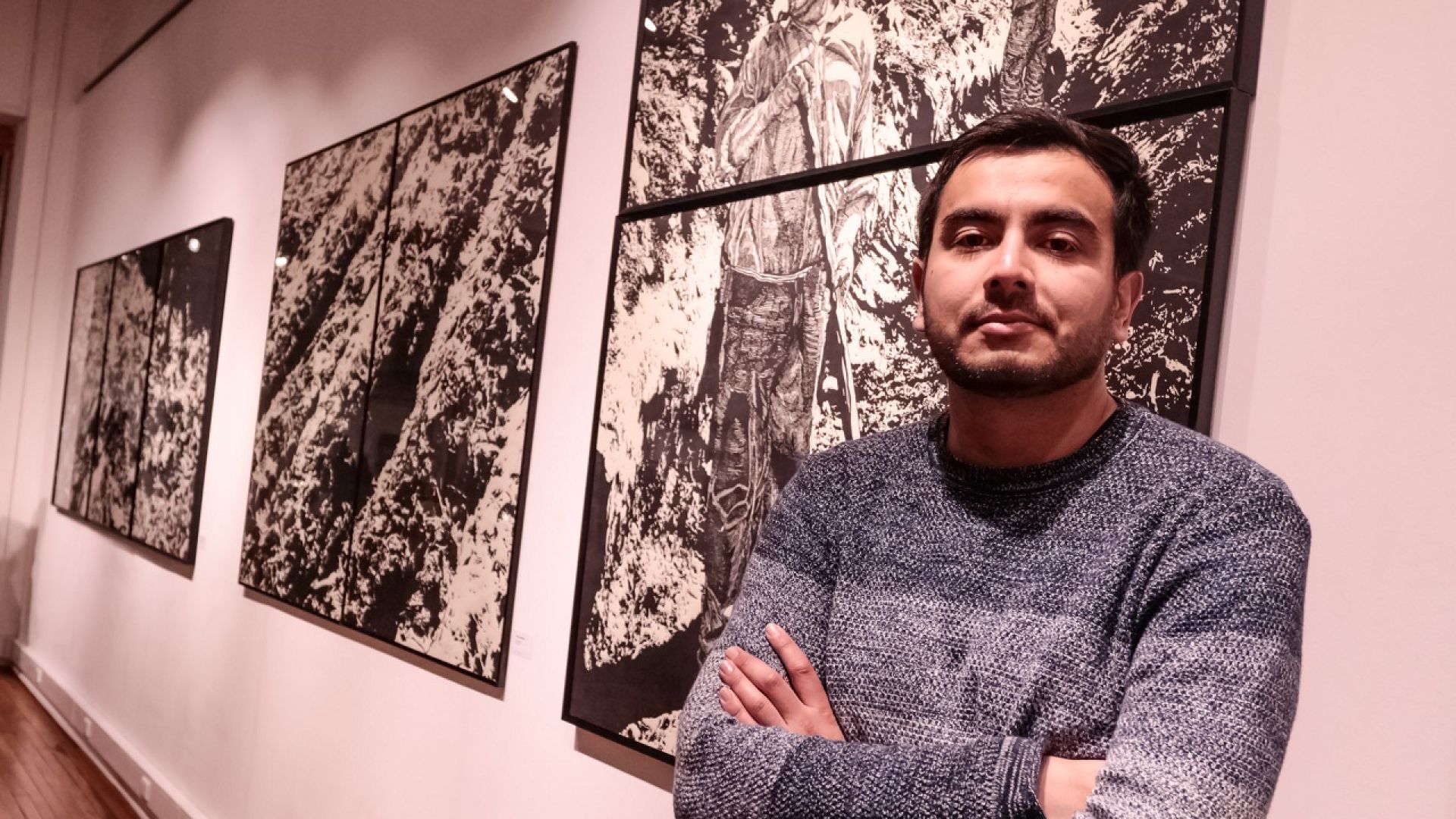 Óscar González explica el título de su exposición: “Líneas para definir un poco el grabado, que es en base a líneas, es más gráfico, y pala y piedra porque se nota que es gente de campo —yo soy de Paine—. Este es un trabajo de cuatro años; en un momento hay mucha xilografía, después aguafuerte, después speedball, que es otra técnica que fui descubriendo con el tiempo; entonces, cada obra es un proceso de aprendizaje en el grabado, pero además es un tema que voy trabajando desde que estoy en la universidad hasta que salgo y hasta ahora”.