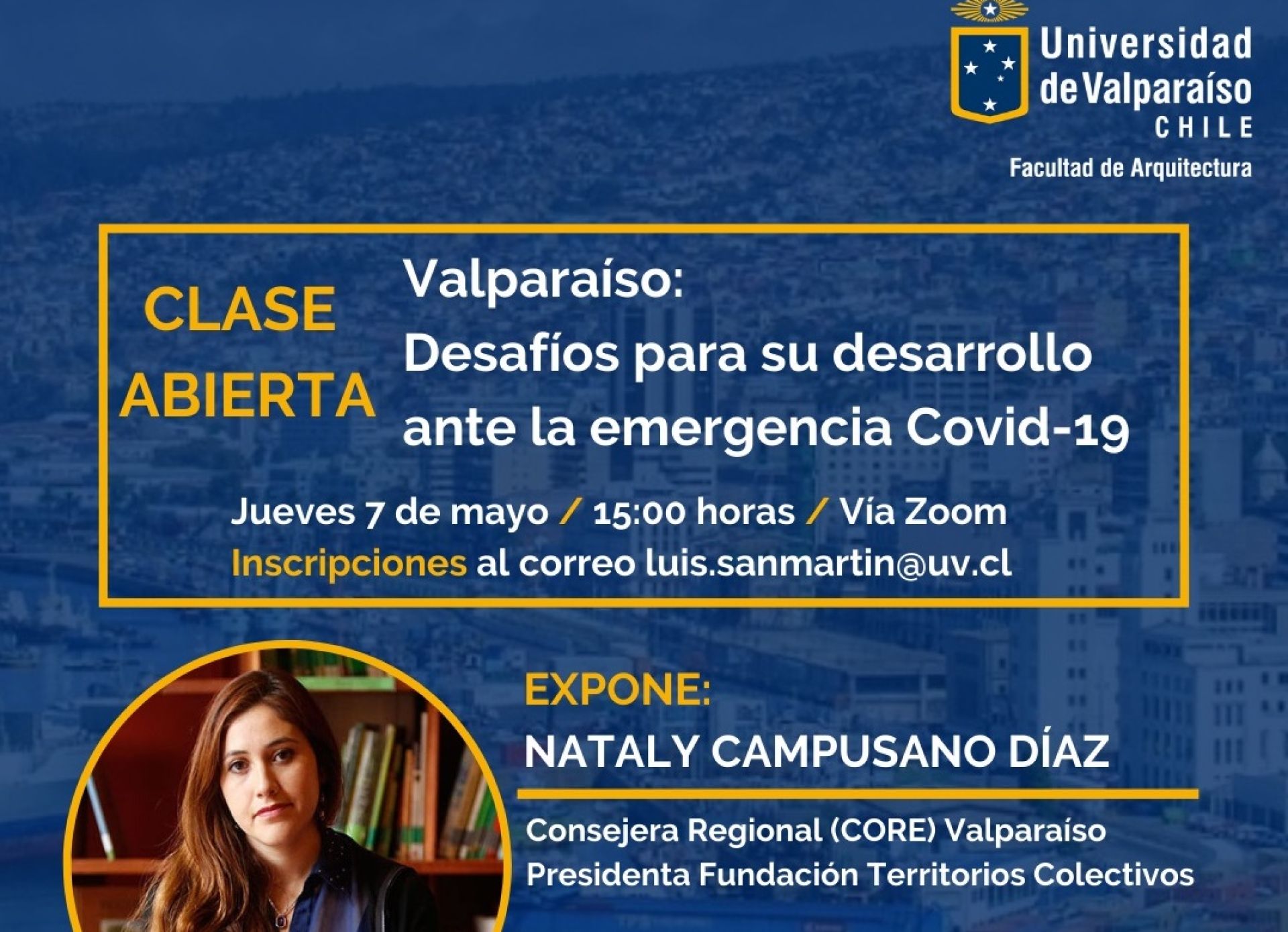 La actividad se desarrollará este jueves 7 de mayo, desde las 15 horas, y estará a cargo de la consejera regional Nataly Campusano, presidenta de la Fundación Territorios Creativos. Dado su carácter de clase abierta, tratará sobre los nuevos desafíos de Valparaíso ante la emergencia sanitaria en materia de políticas públicas para su desarrollo.