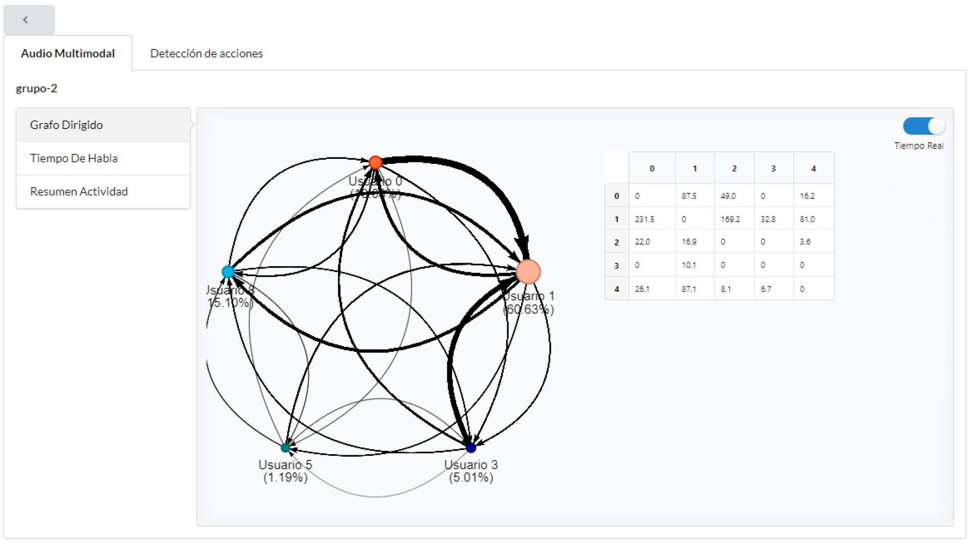 El tamaño de los nodos representa el tiempo de habla de cada participante, mientras que el grosor de sus aristas indica el número de procesos dialógicos llevado a cabo entre participantes. Gracias a estas visualizaciones, el profesor a cargo de la actividad educativa puede ir verificando el desarrollo de habilidades blandas que usualmente no pueden medirse cuantitativamente, como la capacidad de colaboración grupal o la capacidad de liderazgo de equipos.
