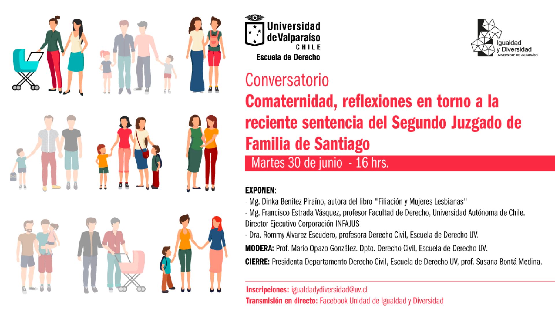 El conversatorio “Comaternidad, reflexiones en torno a la reciente sentencia del Segundo Juzgado de Familia de Santiago” se realizara el martes 30 de junio, a las 16:00 horas, vía Zoom, y será transmitido en directo por el Facebook Unidad de Igualdad y Diversidad.