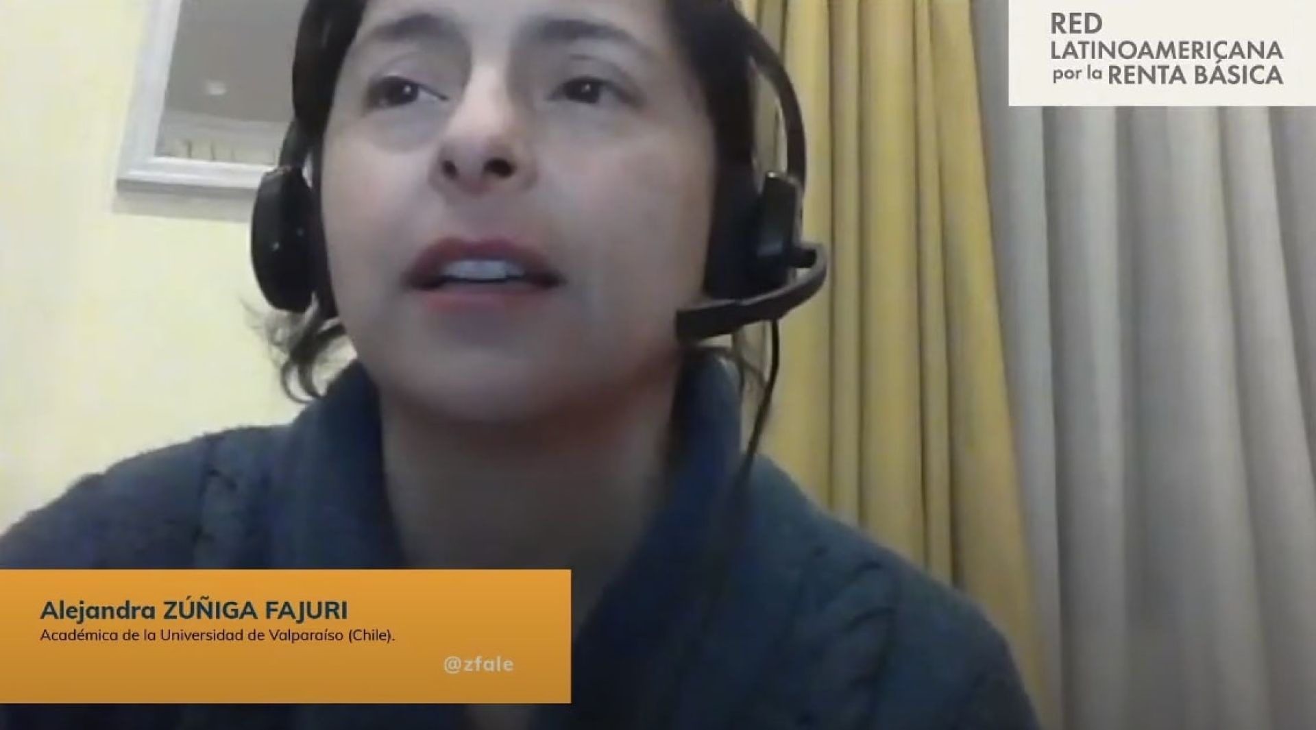 Una amplia reflexión sobre la situación de la mujer, las condiciones relevadas por la pandemia del Covid-19 y la renta básica realizó la profesora de la Escuela de Derecho de la Universidad de Valparaíso Alejandra Zúñiga en el seminario digital “Actualidad y pertinencia de la Renta Básica Universal desde una perspectiva Latinoamericana”, organizado por la Red Latinoamericana por la Renta Básica y el Instituto Centroamericano de Estudios Fiscales (ICEFI).