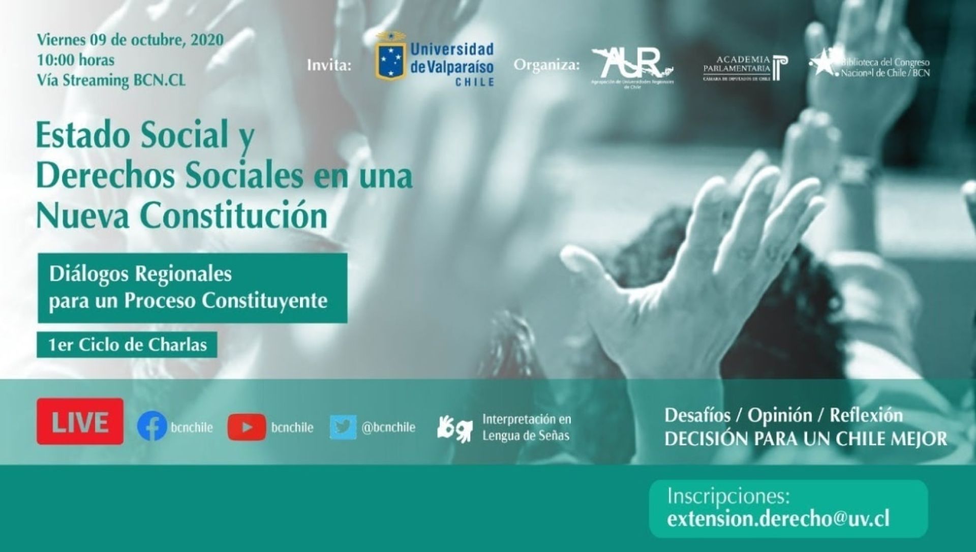La Universidad de Valparaíso -a través de la Escuela de Derecho- participará en el ciclo de charlas "Diálogos regionales para el proceso constituyente", actividad gratuita y abierta a la ciudadanía, organizada en conjunto por la Biblioteca del Congreso Nacional (BCN), las Facultades de Derecho de la Agrupación de Universidades Regionales (AUR) y la Academia Parlamentaria.
