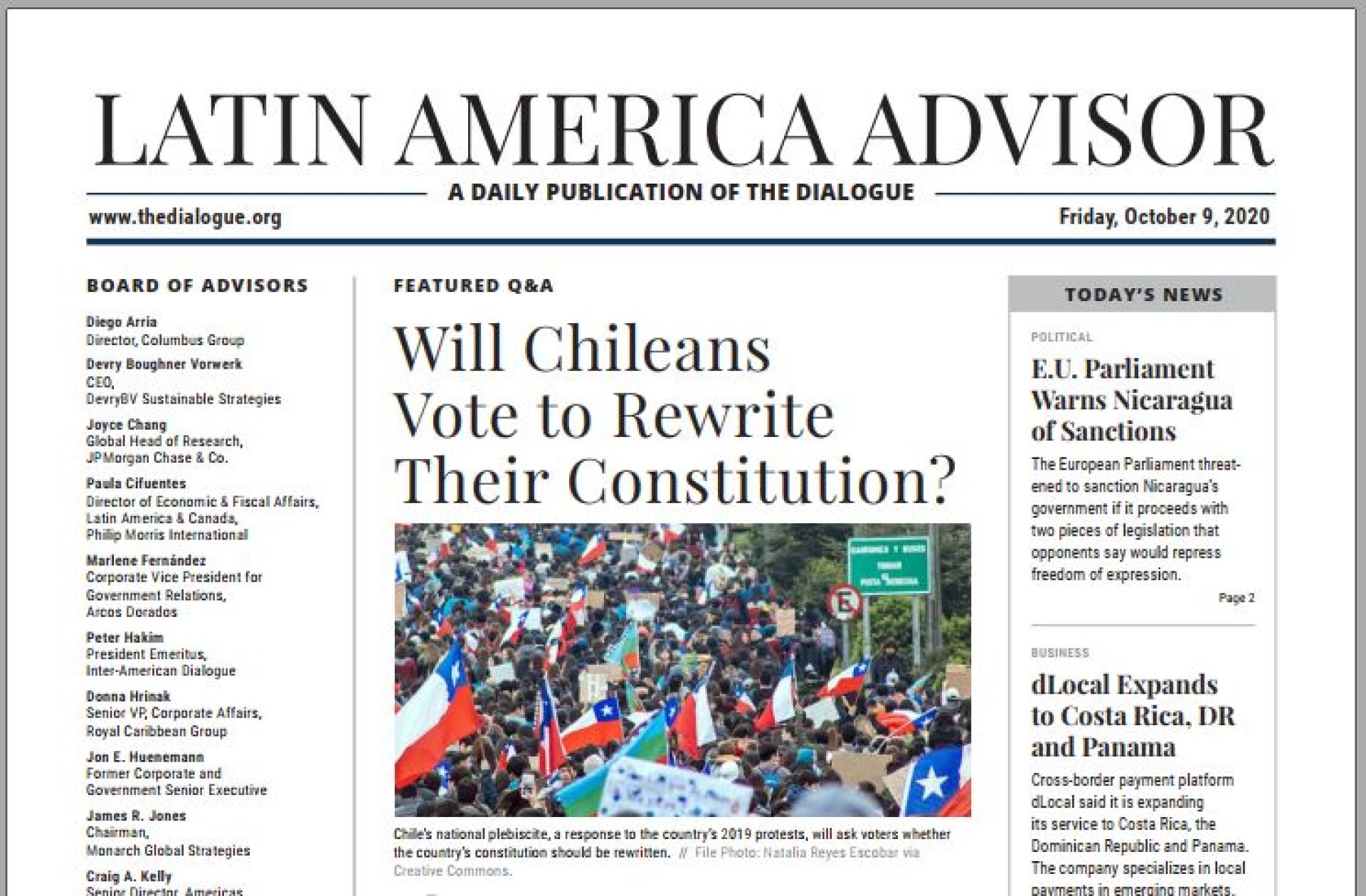 La académica Daniela Jara Leiva, de la Escuela de Sociología UV, fue entrevistada por el Latin American Advisor, en su edición del pasado viernes 9 de octubre, en el contexto de un artículo titulado Will Chileans Vote to Rewrite Their Constitution?, el cual se puede revisar completo en /www.thedialogue.org/analysis/will-chileans-vote-to-rewrite-their-constitution/