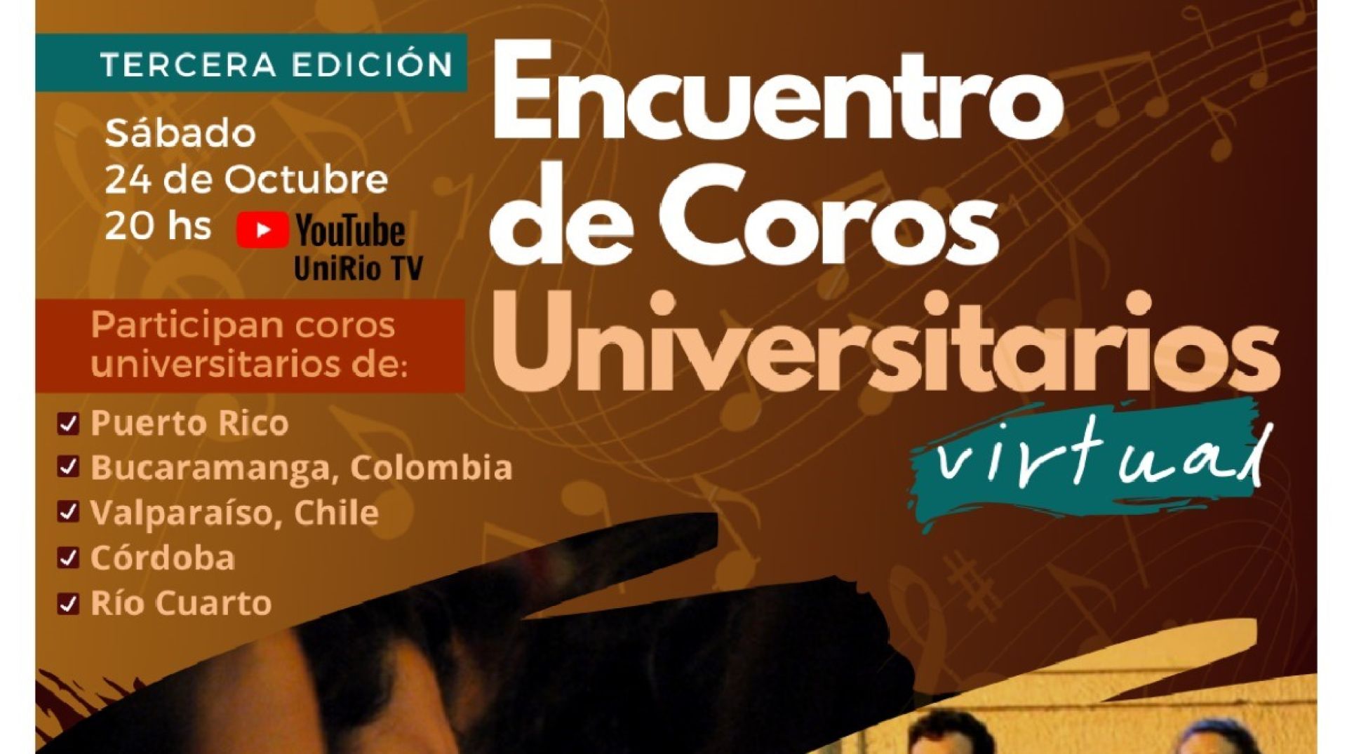 Este Tercer Encuentro de Coros Universitarios tendrá lugar este sábado 24 de octubre, a partir de las 20:00 horas, y será transmitido por el canal YouTube de UniRio TV. Luego de la presentación de los grupos corales se realizará el conversatorio “Los Coros universitarios en Latinoamérica: desafíos en tiempos de pandemia”, a cargo de los Directores participantes.