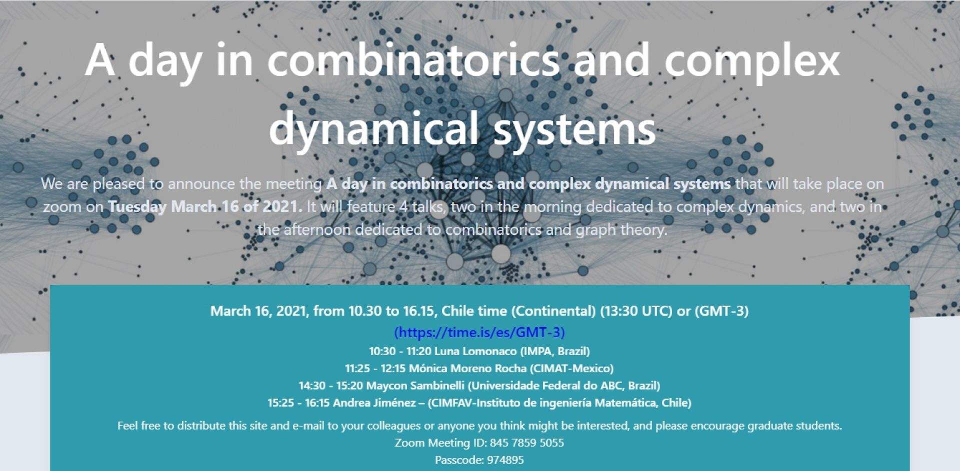 "A day in combinatorics and complex dynamical systems" es el nombre del seminario al que están invitando los académicos e investigadores Andrea Jiménez y Gerardo Honorato, del Instituto de Ingeniería Matemática de la Facultad de Ingeniería de la Universidad de Valparaíso. La actividad se realizará este martes 16 de marzo, desde las 10:30 horas, de forma remota.