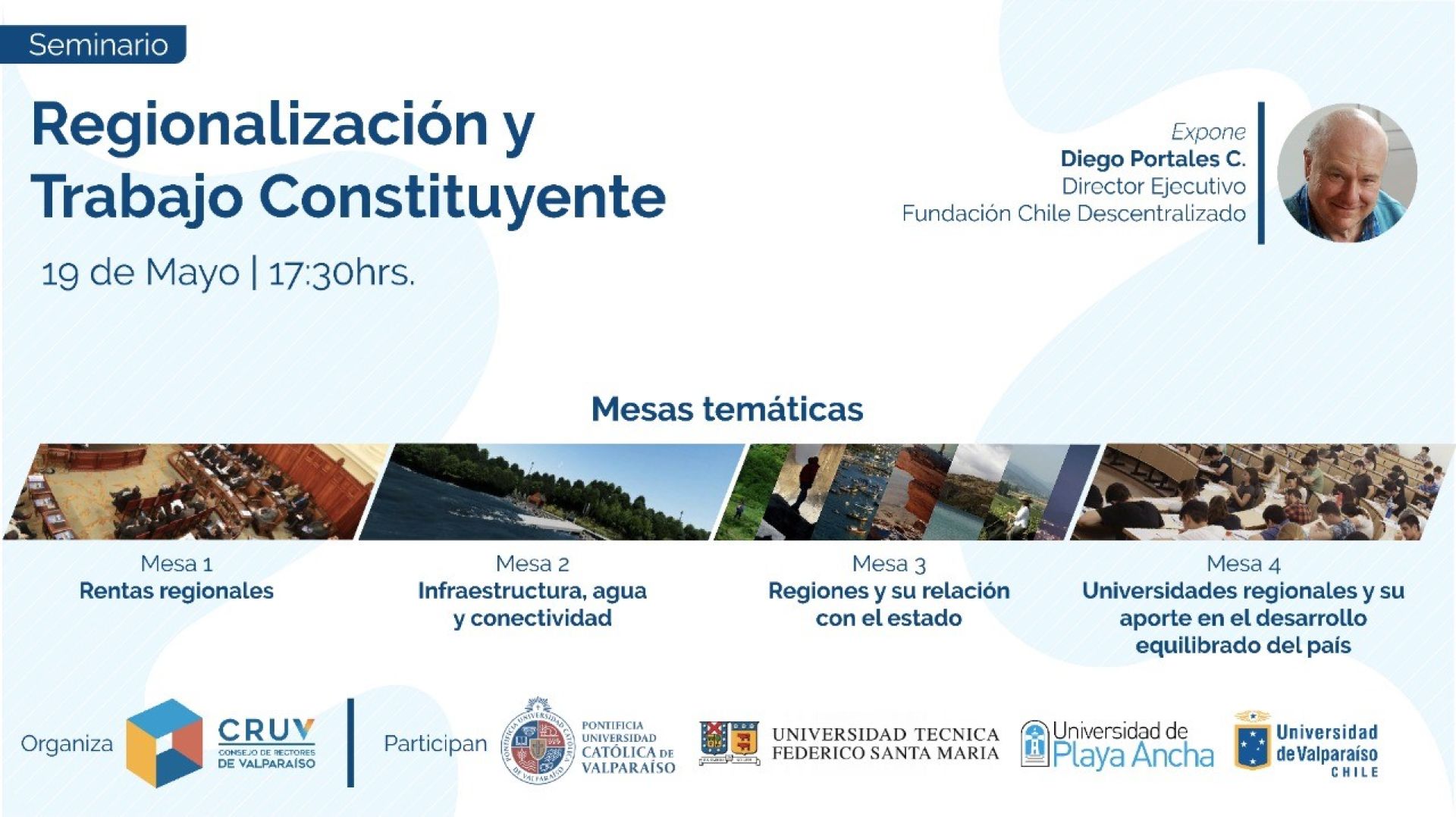Luego de la exposición de Portales, se abrirán espacios para dialogar sobre aspectos que podrían ser cruciales en el proceso constituyente. La primera mesa será liderada por Ignacio Walker, de la PUCV, con el tema “Rentas Regionales”; la segunda, por Pedro Sariego, de la USM, con “Infraestructura, agua y conectividad”; la tercera, por Diego del Barrio, director de la Escuela de Administración Pública de la UV, con “Regiones y su relación con el Estado”; y la cuarta, por Patricio Sanhueza, rector de la UPLA, con “Universidades regionales y su aporte para el desarrollo equilibrado del país”.