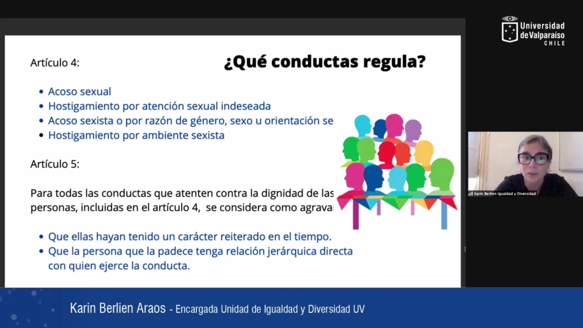En cuanto a los detalles del reglamento, la directora de la Unidad de Igualdad y Diversidad indico que opera para estudiantes de pre y postgrado, funcionarios y funcionarias académicos y no académicos. Es aplicable en recintos o dependencias universitarias, incluidos los campos clínicos, y actividades extraprogramáticas en que participa la comunidad UV.