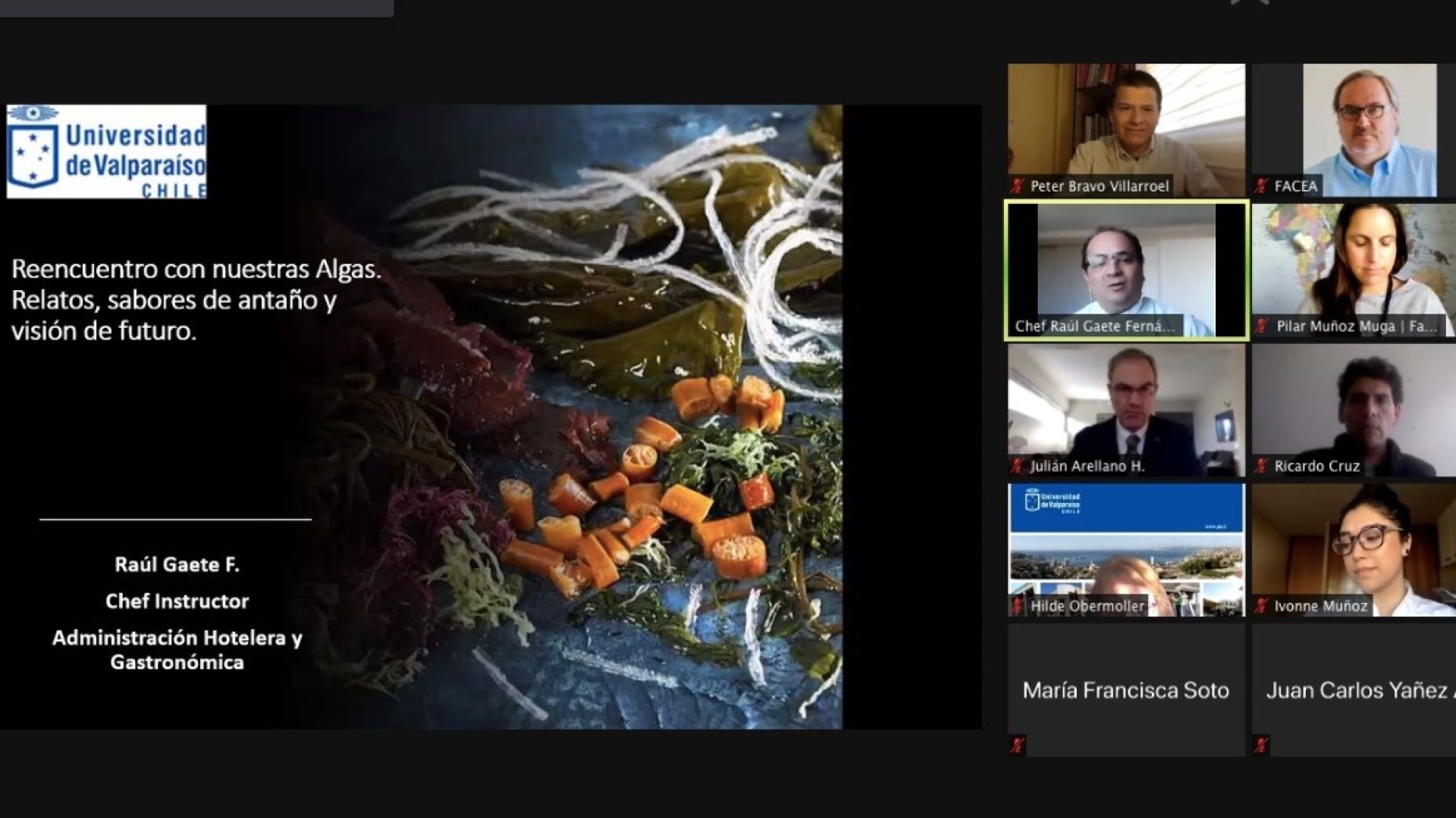 En la oportunidad expusieron el doctor Ricardo Cruz, del Instituto de Investigaciones Oceanológica de México, de la Universidad de Baja California de México; la profesora Pilar Muñoz, de la Escuela de Biología Marina de la Universidad de Valparaíso; y los chefs instructores Ivonne Muñoz y Raúl Gaete, de la Escuela de Administración Hotelera y Gastronómica, quienes abordaron desde la perspectiva nutricional y organoléptica el uso de las algas en la cocina internacional.