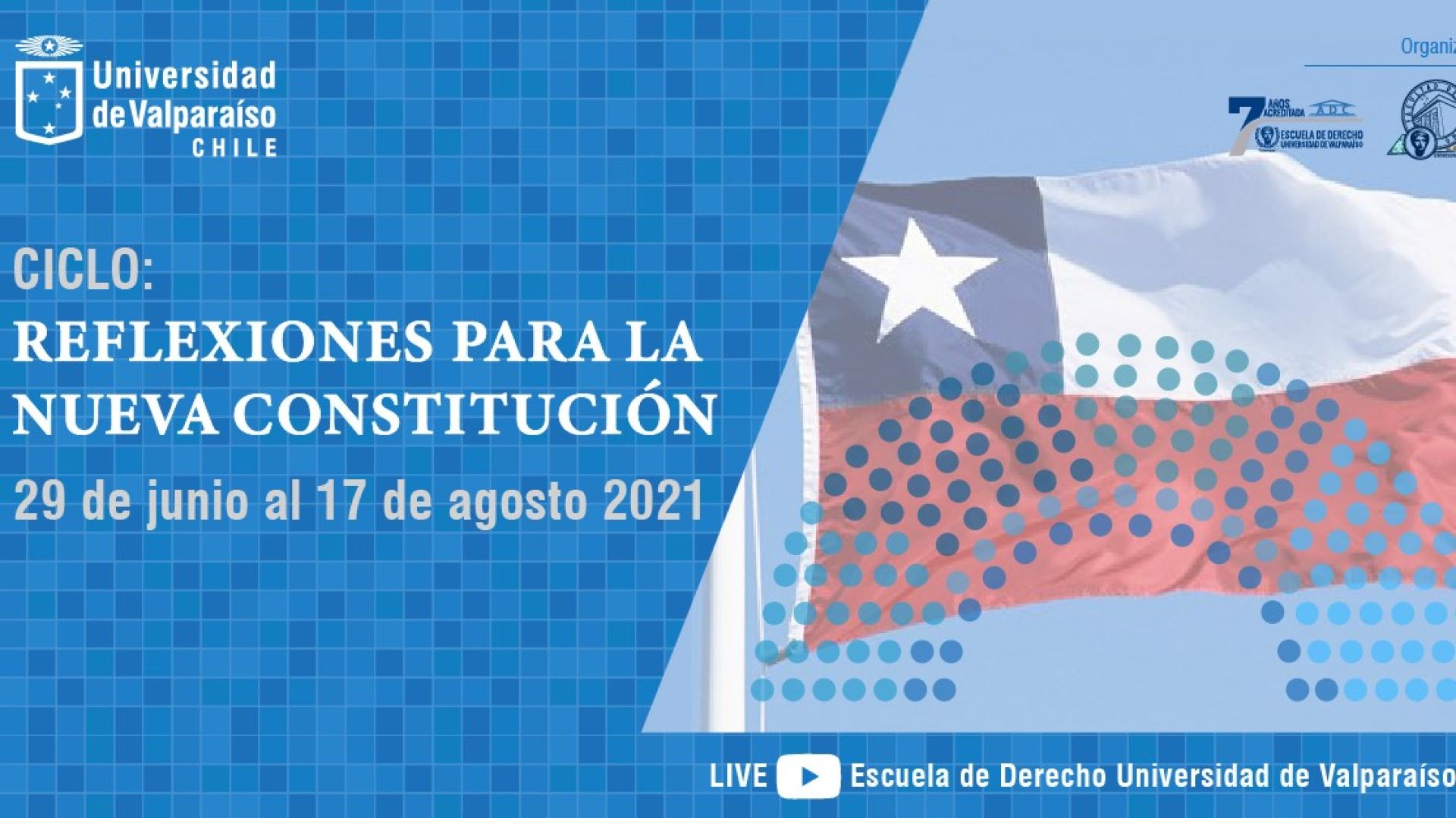 Las sesiones del ciclo “Reflexiones para la nueva constitución” se llevarán a cabo entre el 6 de julio y el 17 de agosto de 2021, y serán transmitidas en vivo a través del canal de YouTube Escuela de Derecho Universidad de Valparaíso.
