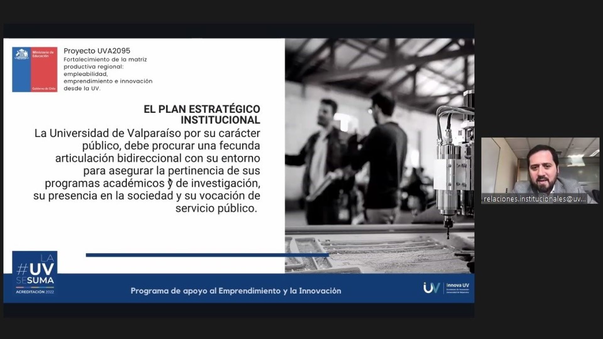 El proyecto consiste en un programa de capacitación con foco en pymes, emprendimiento e innovación; una plataforma de canalizaciones de requerimientos de la industria a la Universidad; disposición de ocho espacios de la UV habilitados y disponibles para el ecosistema regional; un programa de acompañamiento para desarrollo de proyectos de innovación para la competitividad, y un concurso para la incubación de proyectos multidisciplinarios para el fortalecimiento de la innovación y el emprendimiento en la Región de Valparaíso. Este concurso, para académicos + alumnos + emprendedores, ofrece hasta un millón de pesos para un prototipo de baja complejidad, y un millón y medio de pesos para MVP.