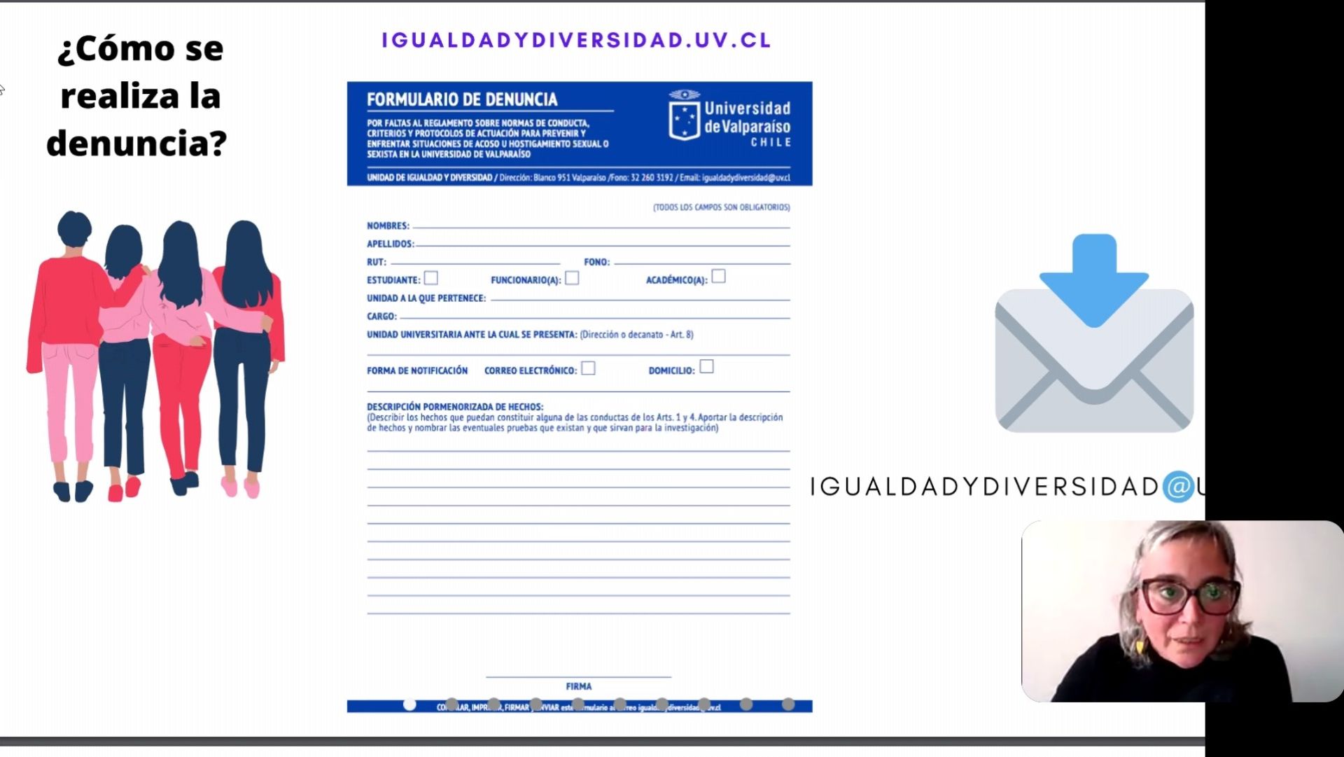 La académica explica algunos conceptos relacionados al tema, presenta datos estadísticos de la Universidad de Valparaíso, y destaca las vías que han sido diseñadas para la denuncia, las que están abiertas para estudiantes, funcionarios y académicos, independiente de su género. Aconseja asimismo sobre las mejores formas de proceder en caso de recibir una denuncia, a la vez que detalla el curso que siguen los procedimientos y los plazos que demoran.