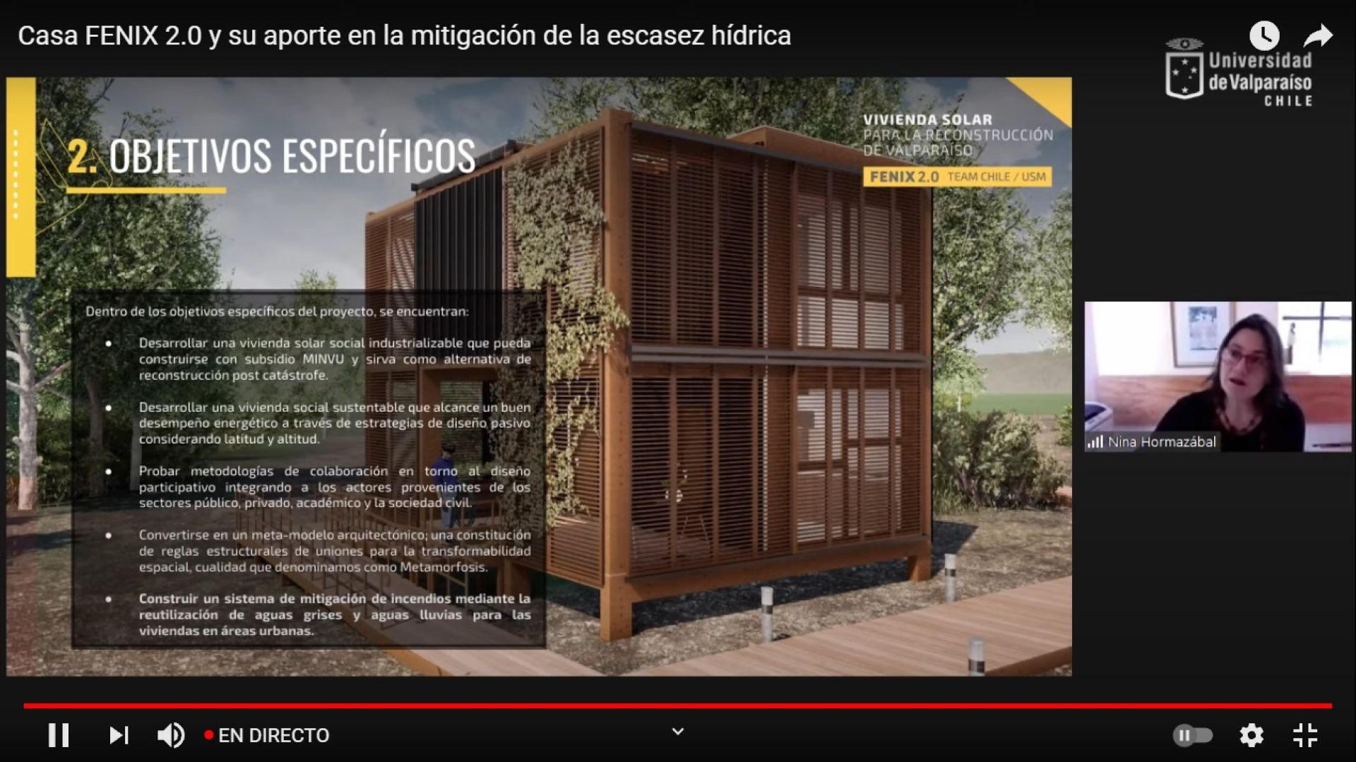 La doctora Nina Hormazábal, académica del Departamento de Arquitectura de la Universidad Técnica Federico Santa María, estuvo a cargo de la conferencia, en la que explicó que Casa FENIX 2.0 es una vivienda solar social para la reconstrucción de Valparaíso. Se trata de la primera vivienda experimental y unifamiliar reconstruida post incendio de la Navidad 2019 en el Cerro Rocuant, diseñada especialmente para una familia de Valparaíso.