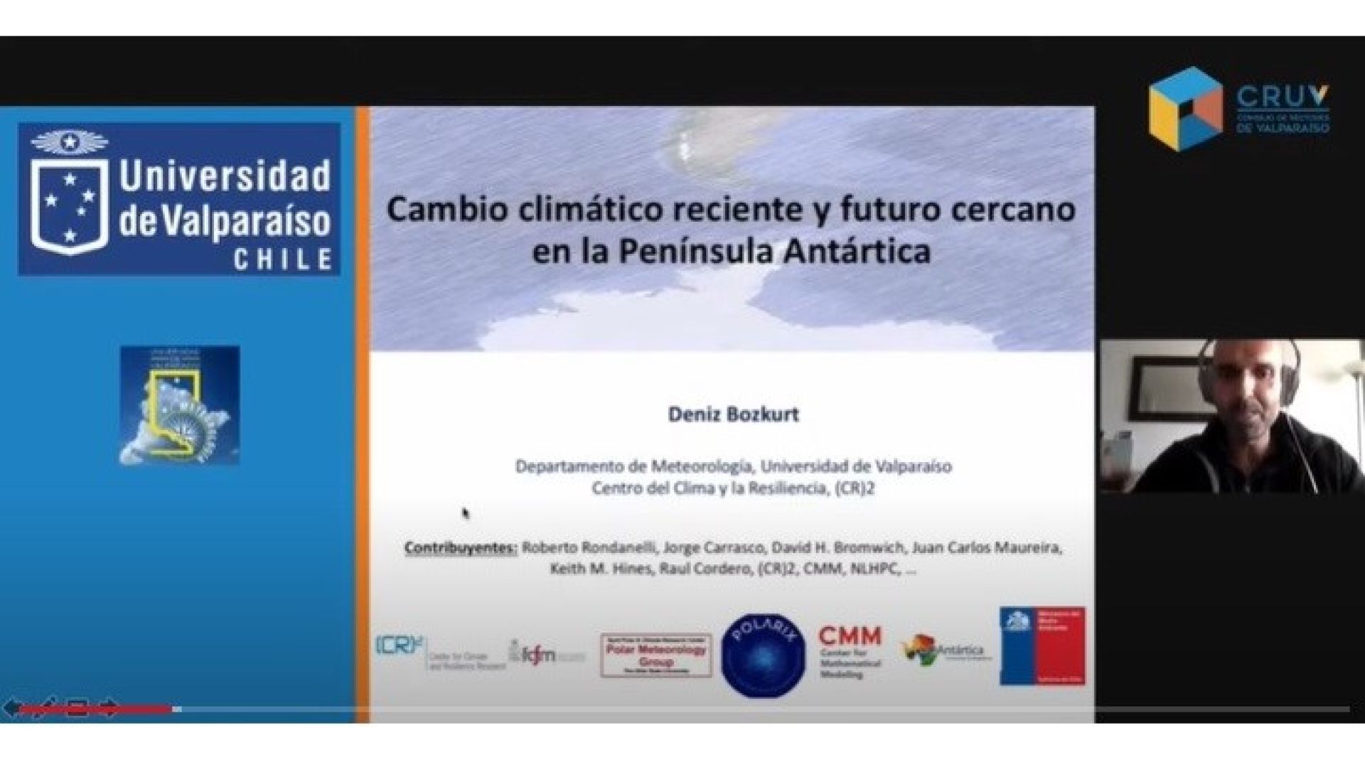 La exposición del doctor Bozkurt, titulada “Cambio climático reciente y futuro cercano en la península Antártica” exploró las tendencias al calentamiento en el largo plazo (en los últimos sesenta años) en los meses de verano en esta zona del continente antártico, qué factores influyen en ese proceso y también advirtió que en períodos más cortos de tiempo -y en años más recientes- se han observados fases de enfriamiento, lo que respondería a que el área estudiada se encuentra muy influenciada por la variabilidad natural interna de circulación atmosférica regional y a que también está expuesta a fenómenos meteorológicos extremos, entre otros factores. Asimismo, realizó proyecciones para las próximas dos décadas, utilizando modelamientos y simuladores globales.
