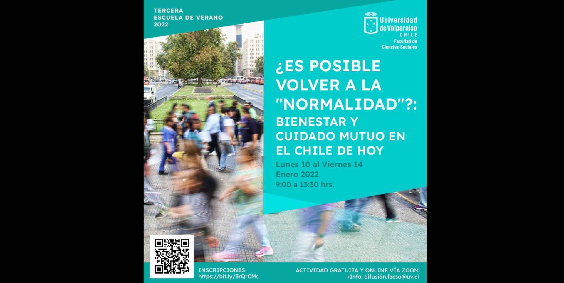 “¿Es posible volver a la ‘normalidad’?: Bienestar y cuidado mutuo en el Chile de hoy” se denomina la Tercera Escuela de Verano 2022 de la Facultad de Ciencias Sociales (Facso) de la Universidad de Valparaíso. La actividad será gratuita y se desarrollará de manera remota del lunes 10 al viernes 14 de enero, de 09:00 a 13:30 horas.