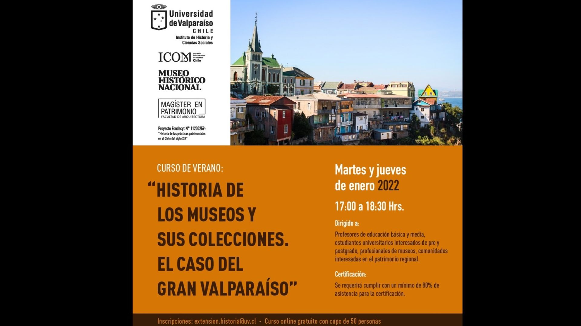 La iniciativa tiene el propósito de conocer, caracterizar, reflexionar y discutir las diversas iniciativas en el ámbito patrimonial que han configurado proyectos de museos en el Gran Valparaíso. Las clases tendrán lugar los martes y jueves de enero, de 17 a 18:30 horas, de manera remota.