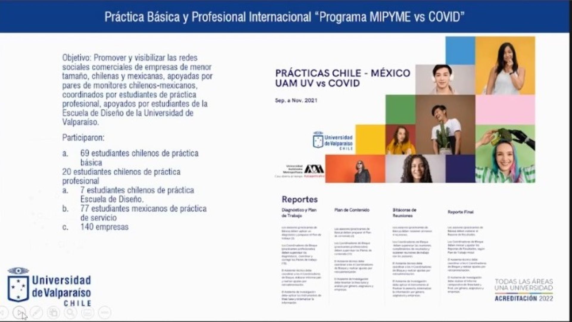La profesora Leslie Bridshaw, coordinadora del programa, señaló que el proyecto ha sido muy fructífero, alcanzando las metas y objetivos propuestos. “Contamos con la participación de 69 estudiantes de práctica básica y veinte estudiantes de práctica profesional de Ingeniería Comercial, 77 estudiantes mexicanos colaboraron con el proyecto, más siete estudiantes de práctica de la Escuela de Diseño de la Universidad de Valparaíso y 140 emprendedores”.
