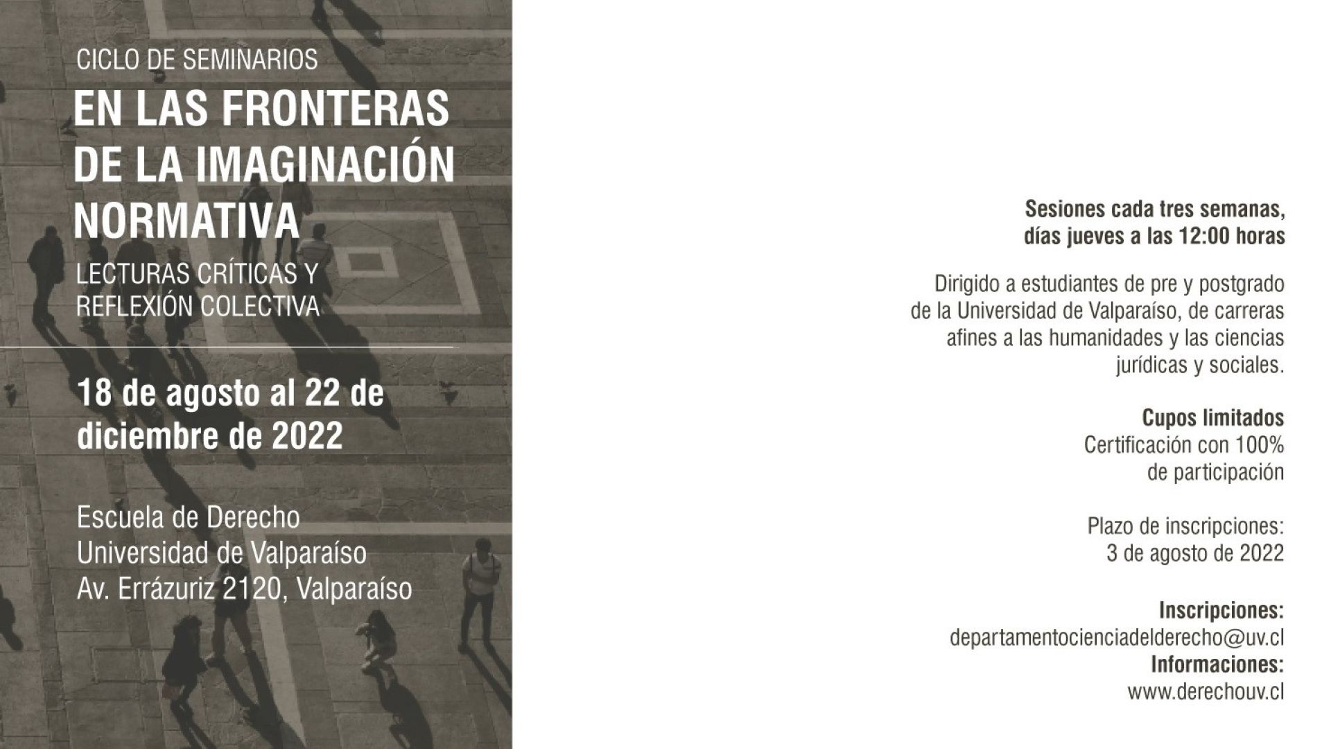 La iniciativa está dirigida a estudiantes de pre y postgrado de la Universidad de Valparaíso de carreras afines a las humanidades y las ciencias jurídicas y sociales, y que presenten interés y compromiso con la participación y asistencia durante el período que abarcan los ciclos del seminario.