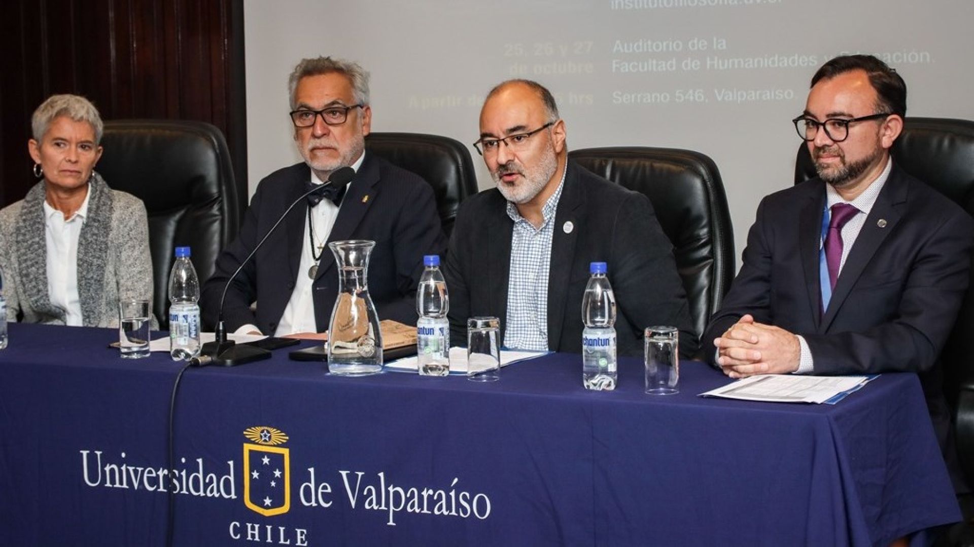 El programa de la Semana de la Filosofía se inició con la conferencia inaugural de Miguel Orellana, académico de la Facultad de Derecho de la Universidad de Chile y doctor en Filosofía por la Universidad de Oxford, Reino Unido. Lo acompañaron en la ceremonia de inicio Jaime Jamett, director de Campos Clínicos de la Vicerrectoría Académica UV; Ángela Vallejos, secretaria de facultad, y Marcelo Arancibia, director del Instituto de Filosofía.