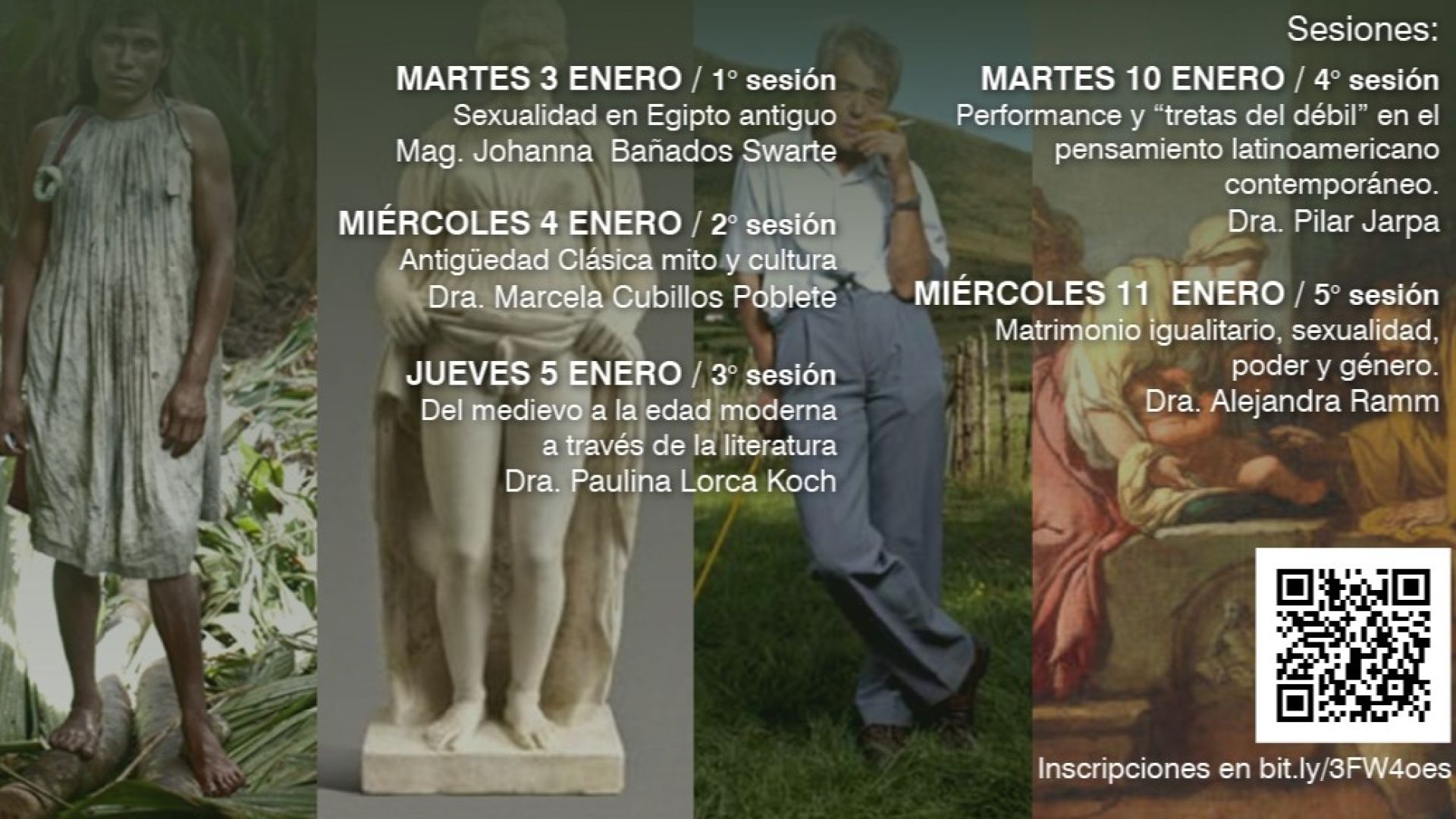 Las sesiones del curso serán las siguientes: martes 3, “Sexualidad en Egipto antiguo”, Joanna Bañados; miércoles 4, “Antigüedad clásica, mito y cultura”, Marcela Cubillos Poblete; jueves 5, “Del medievo a la edad moderna a través de la literatura”, Paulina Lorca”; martes 10, “Filosofía en todo género. Performance, parodia y otras ‘tretas del débil’ en el pensamiento latinoamericano contemporáneo”, Pilar Jarpa, y miércoles 11, “Mundo contemporáneo: matrimonio igualitario, sexualidad, poder y género”, Alejandra Ramm.