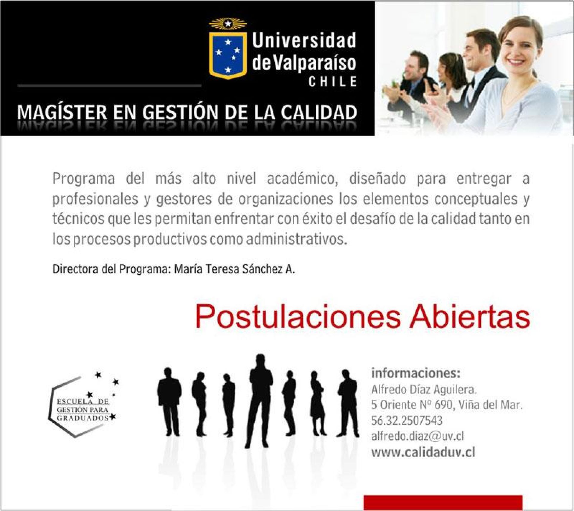 Se encuentran abiertas las inscripciones para el Magíster en Gestión de la Calidad que impartirá en su tercera versión la Universidad de Valparaíso. El programa está diseñado para entregar a profesionales y gestores de organizaciones los elementos conceptuales y técnicos que les permitan enfrentar con éxito el desafío de la calidad, tanto en los procesos productivos como administrativos.
