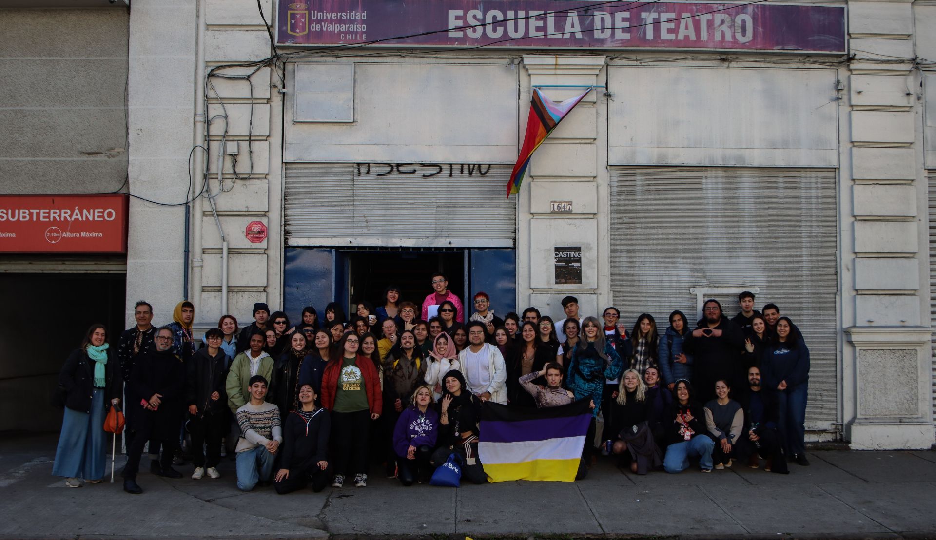En el frontis de la Escuela y como es ya una tradición, estudiantes de Teatro de la Universidad de Valparaíso realizaron el tradicional izamiento de la bandera LGBTIQANB+ como parte de la conmemoración del Mes del Orgullo.