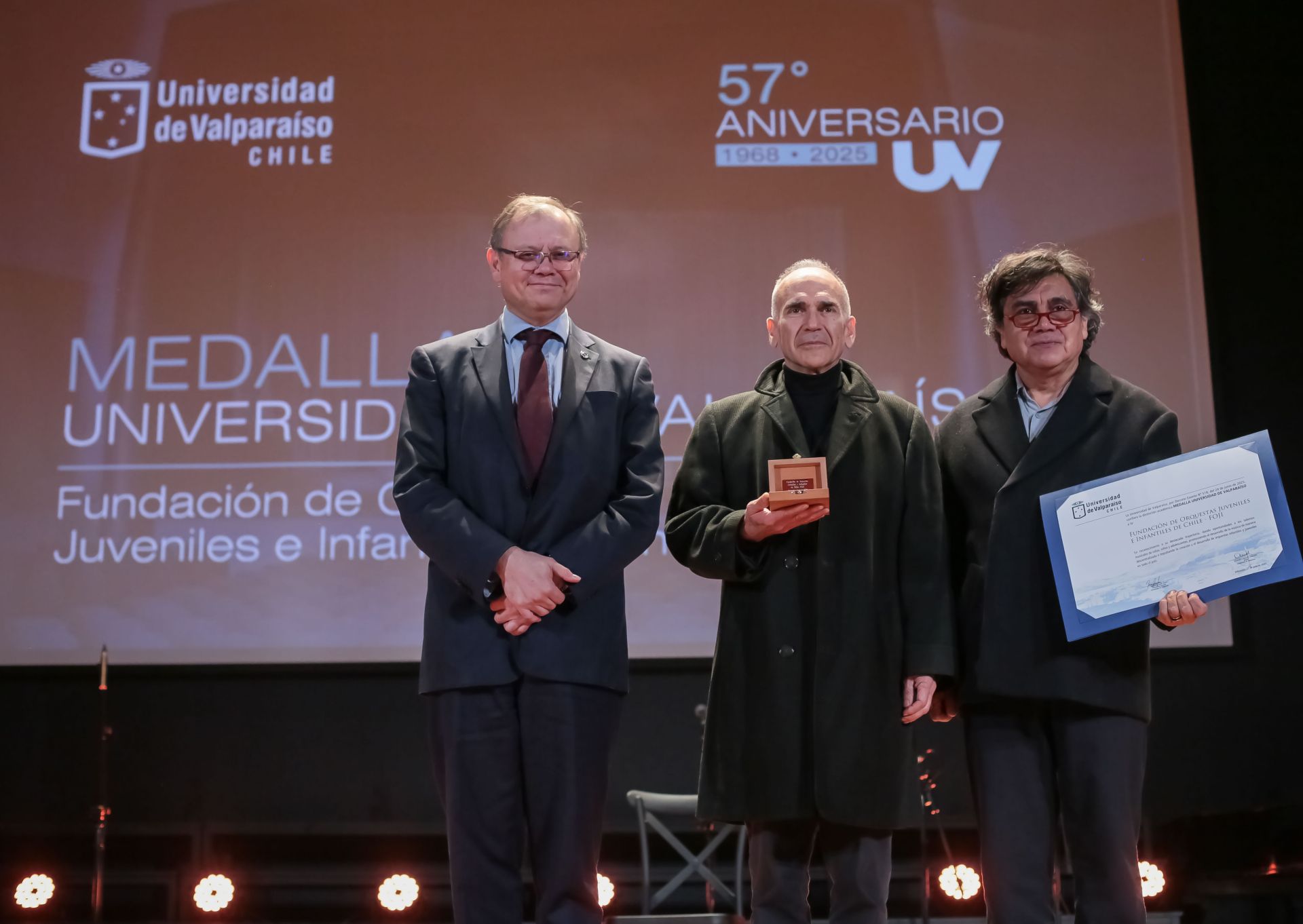 Tres elementos conmemorativos consideró el acto con que la Universidad de Valparaíso celebró su aniversario 2025: el reconocimiento a quienes integran el nuevo Consejo Universitario, la entrega de la Medalla UV a la Fundación Orquestas Juveniles e Infantiles de Chile (FOJI) y un concierto del Ensamble de Cuerdas de la Orquesta Sinfónica Juvenil Regional de Valparaíso.