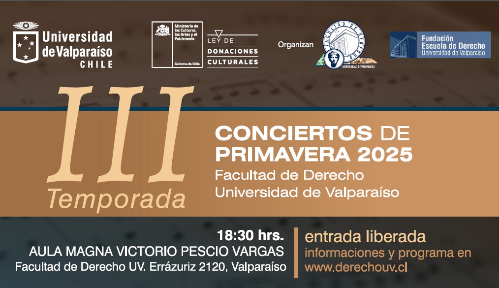 La Temporada de Conciertos de Primavera 2025 es organizada por la Facultad de Derecho de la Universidad de Valparaíso en conjunto con la Fundación Escuela de Derecho, y producida por MGO Medios. El proyecto está acogido a la Ley de Donaciones Culturales del Ministerio de las Culturas, las Artes y el Patrimonio, y cuenta con el patrocinio del Centro de Exalumnos y Amigos de la Escuela de Derecho de la UV, Agunsa, Grupo GEN, y Compañía Marítima Chilena S.A.