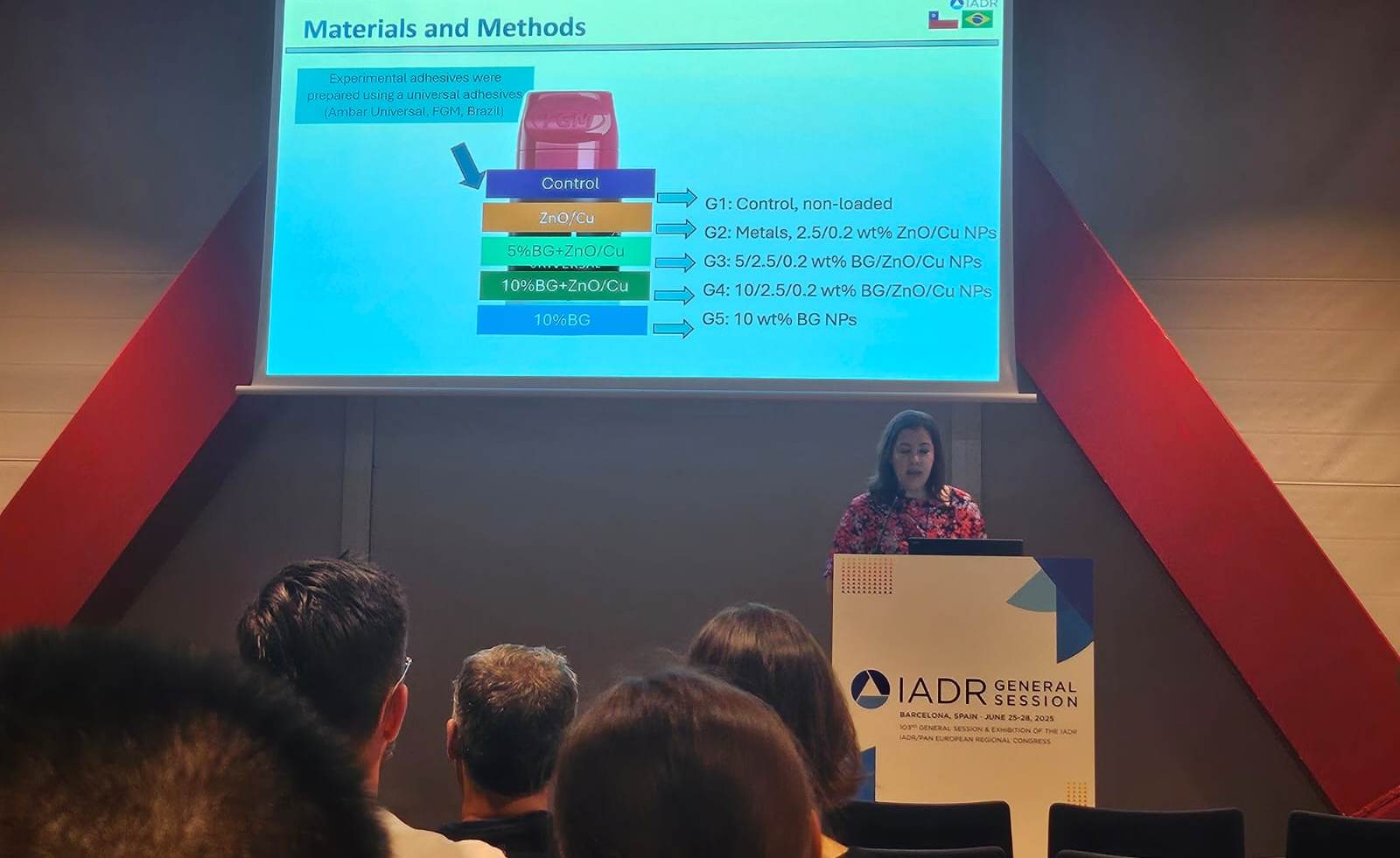 “Viajé a Barcelona para presentar parcialmente los resultados de mi doctorado y así difundir esos avances en la comunidad científica. Mi investigación busca modificar un adhesivo dental con nanopartículas de cobre, zinc y vidrio bioactivo”, explicó la investigadora, quien se encuentra en la etapa final de su Doctorado en Ciencias Odontológicas, programa que realiza con doble titulación en la Universidad de Chile y la Universidad Federal de Ponta Grossa, Brasil.