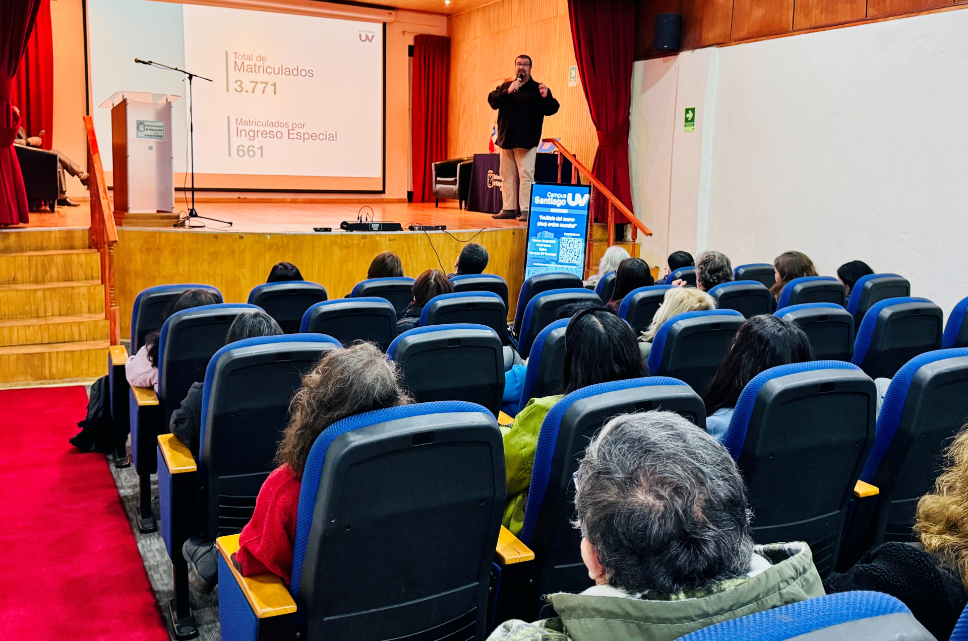 El evento se llevó a cabo en el teatro del recinto de San Miguel y contempló una primera exposición de Gonzalo Cortés, coordinador de la Unidad de Admisión y Promoción de la Vicerrectoría Académica, quien explicó algunas claves del nuevo proceso para postular a los distintos ingresos especiales que tiene la institución en la mayoría de sus carreras, el cual ya se inició.