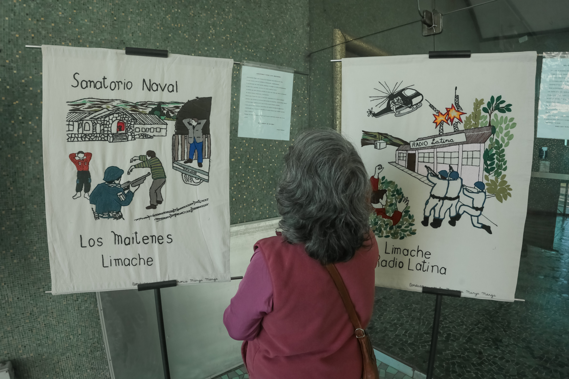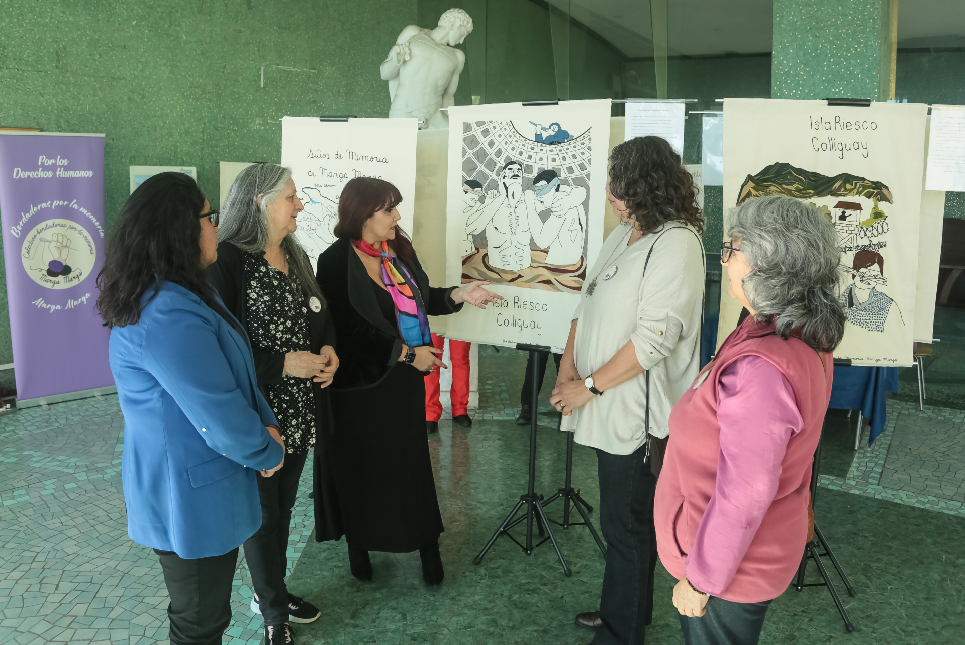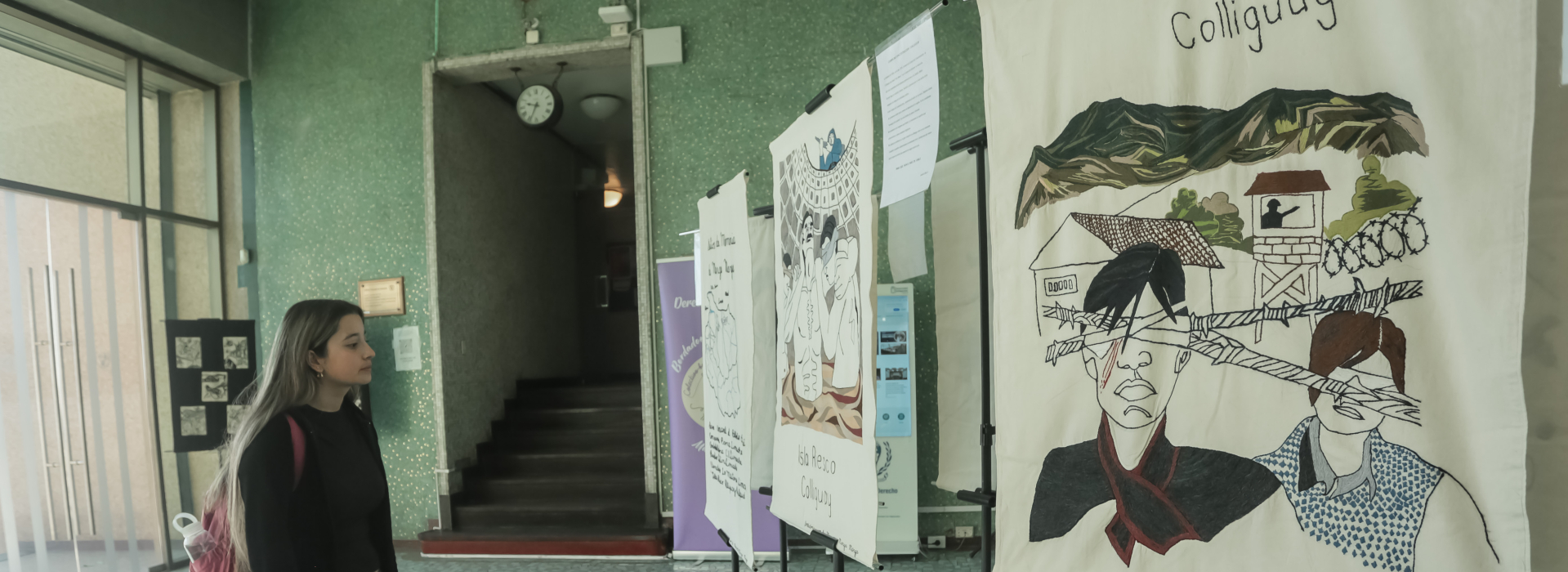 La directora Inés Robles señaló al respecto que “en el marco de la conmemoración del 11 de septiembre, en la Escuela de Derecho el día de hoy —10 de septiembre— tenemos una muestra de bordados realizados por mujeres de la zona de Marga Marga, que hace algunas representaciones gráficas de historias de sobrevivientes de la dictadura y de familiares de ejecutados y detenidos desaparecidos. Es una historia llevada al arte popular con un enfoque muy femenino, que muestra parte de nuestra historia, la cual no debemos olvidar y siempre tenemos que recordar. Es una forma de construir de memoria, la que queremos compartir con todas nuestras y nuestros estudiantes”.