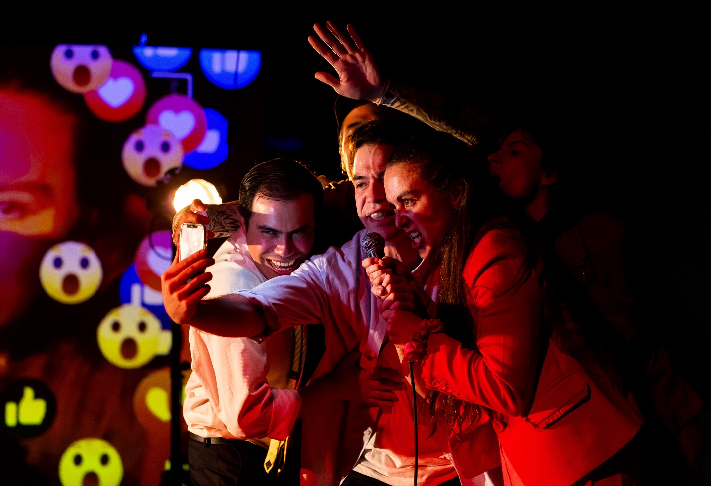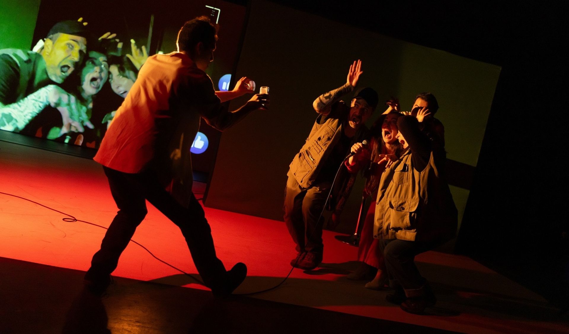 “Entre las técnicas escénicas destaca el uso del trabajo multimedia, la cámara en vivo y la capacidad del elenco para resolver situaciones en escena de manera orgánica. La obra propone un ritmo particular, donde se superponen situaciones, diálogos y textos en una cadencia acelerada. Esta elección responde a la intención de reflejar una sociedad en la que predomina la inmediatez, donde nadie escucha realmente, las palabras se pisan unas a otras y las conversaciones se vuelven ruido. Un modo de evidenciar cómo el exceso de estímulos termina por diluir la posibilidad de diálogo”, agrega.