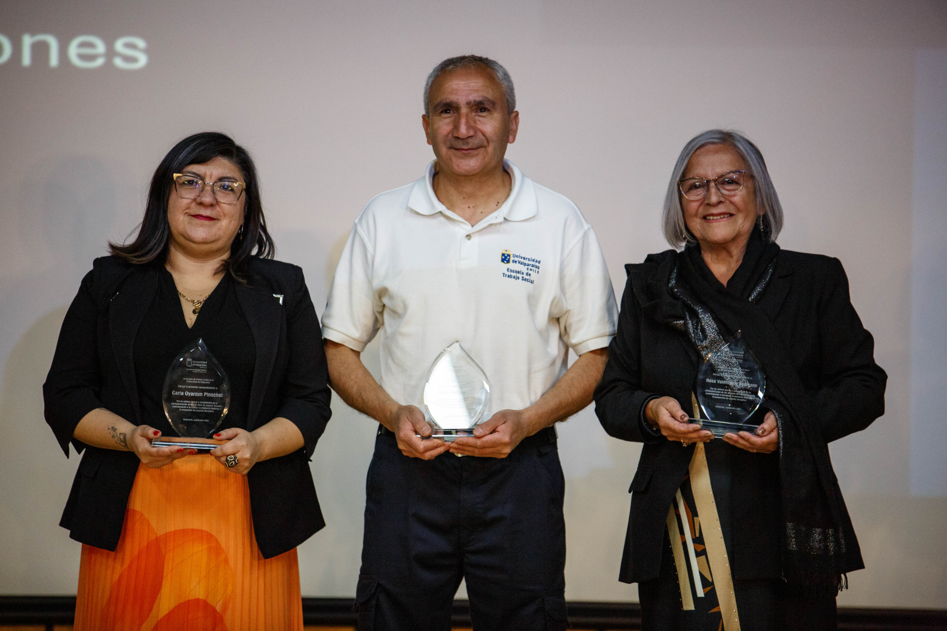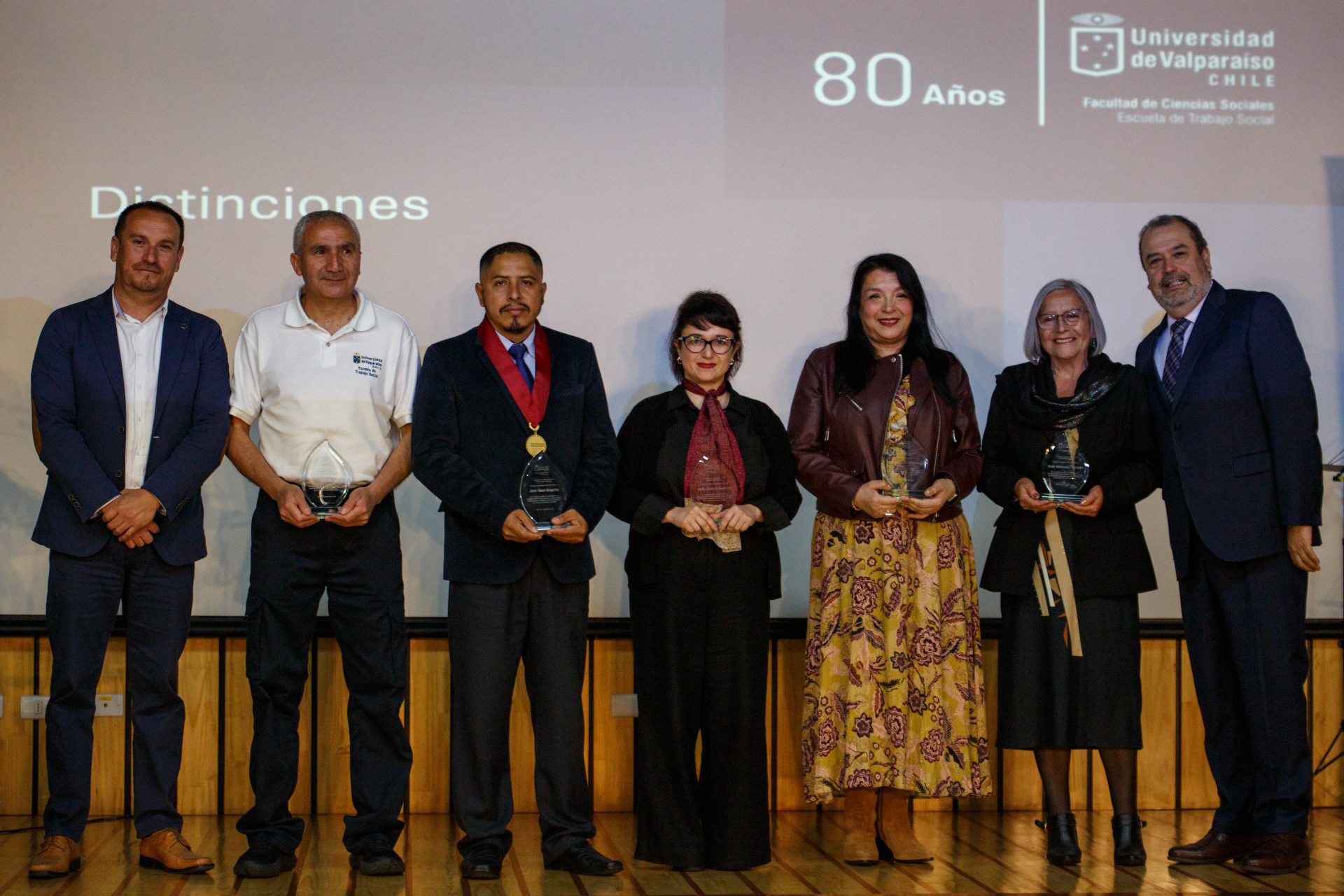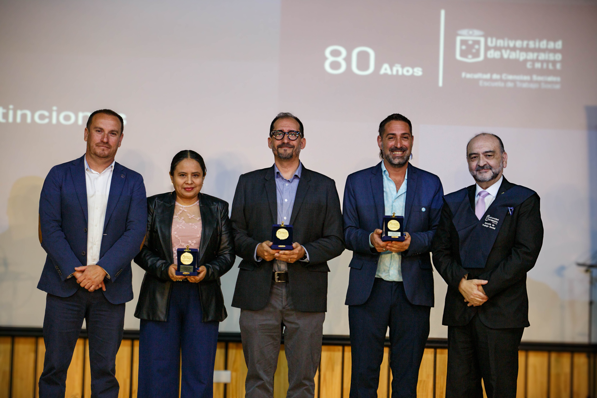 Se hicieron merecedores de este estímulo Pedro Torres Mella, auxiliar con más de treinta años de servicio; Carla Oyarzún Pinochet, exalumna, colaboradora en aula y actual directora regional del Servicio de Protección Especializada a la Niñez y Adolescencia; Rosa Valenzuela Seeman, una de las primeras secretarias de la Escuela, quien desempeñó un rol fundamental en los inicios y consolidación de su comunidad académica; Ketty Cazorla Becerra, exalumna y profesora, cuyo aporte ha sido clave en la docencia, la gestión curricular y la supervisión de prácticas desde 2006; Roxana Ruiz Arancibia, actual secretaria de Dirección, quien es considerada pilar de la gestión administrativa y del acompañamiento al quehacer académico del plantel, y Jhon Yauri Maguiña, académico y profesional peruano, referente del trabajo social clínico en América Latina y actual prefecto regional de Lima.