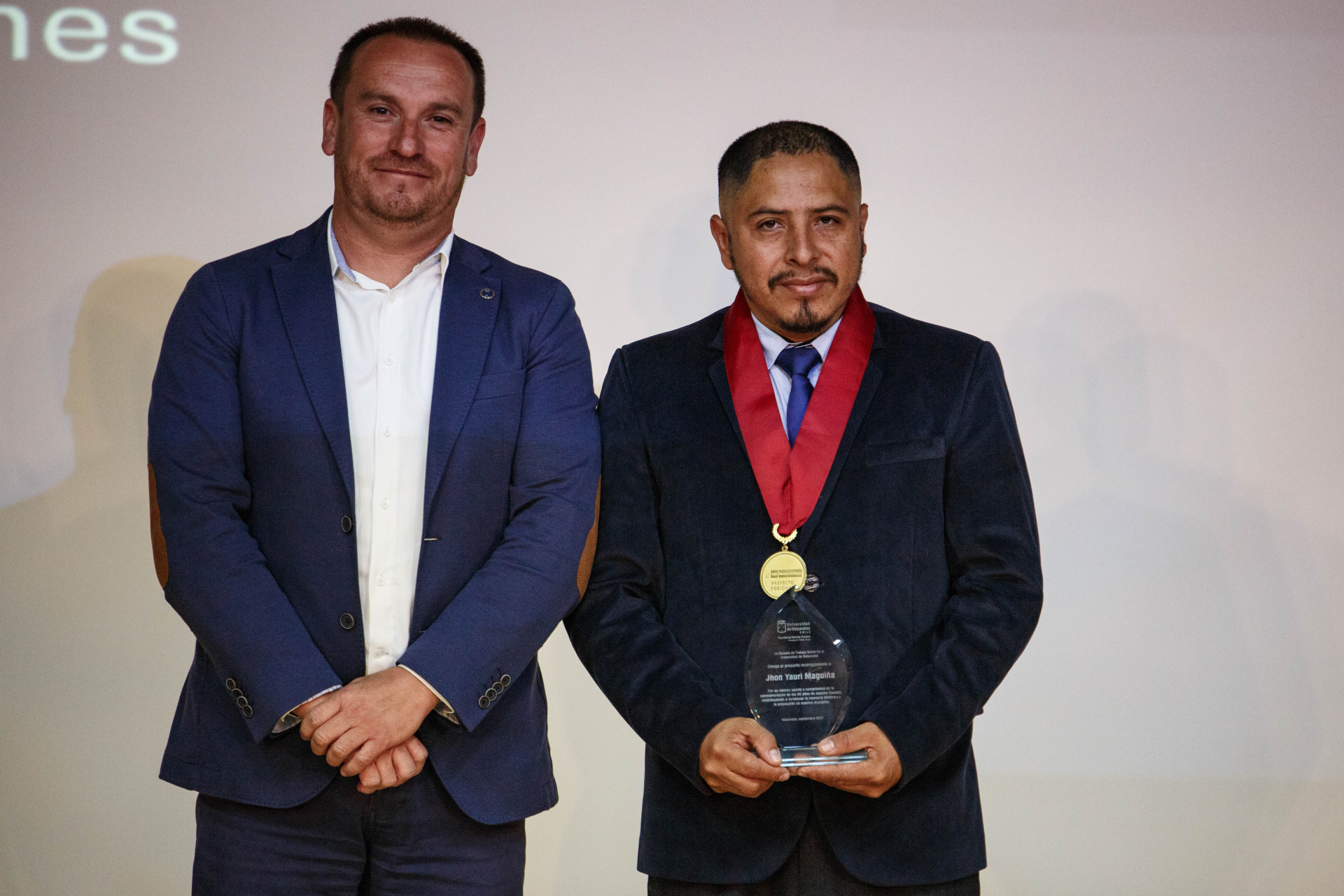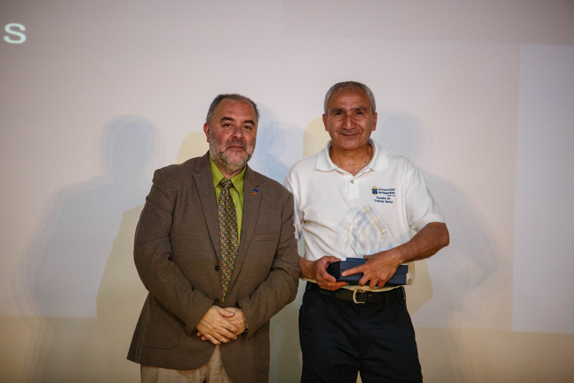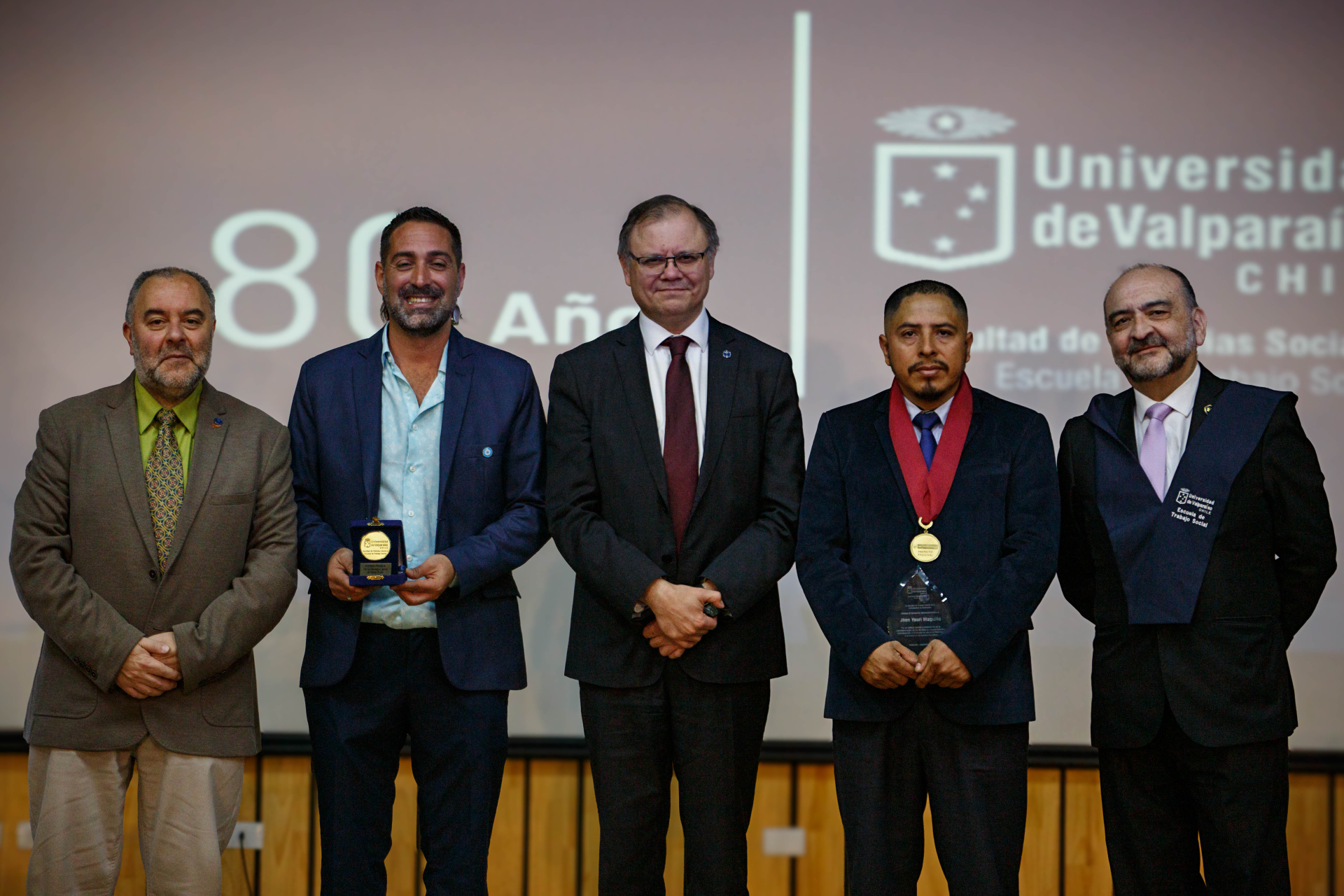 Se hicieron merecedores de este estímulo Pedro Torres Mella, auxiliar con más de treinta años de servicio; Carla Oyarzún Pinochet, exalumna, colaboradora en aula y actual directora regional del Servicio de Protección Especializada a la Niñez y Adolescencia; Rosa Valenzuela Seeman, una de las primeras secretarias de la Escuela, quien desempeñó un rol fundamental en los inicios y consolidación de su comunidad académica; Ketty Cazorla Becerra, exalumna y profesora, cuyo aporte ha sido clave en la docencia, la gestión curricular y la supervisión de prácticas desde 2006; Roxana Ruiz Arancibia, actual secretaria de Dirección, quien es considerada pilar de la gestión administrativa y del acompañamiento al quehacer académico del plantel, y Jhon Yauri Maguiña, académico y profesional peruano, referente del trabajo social clínico en América Latina y actual prefecto regional de Lima.