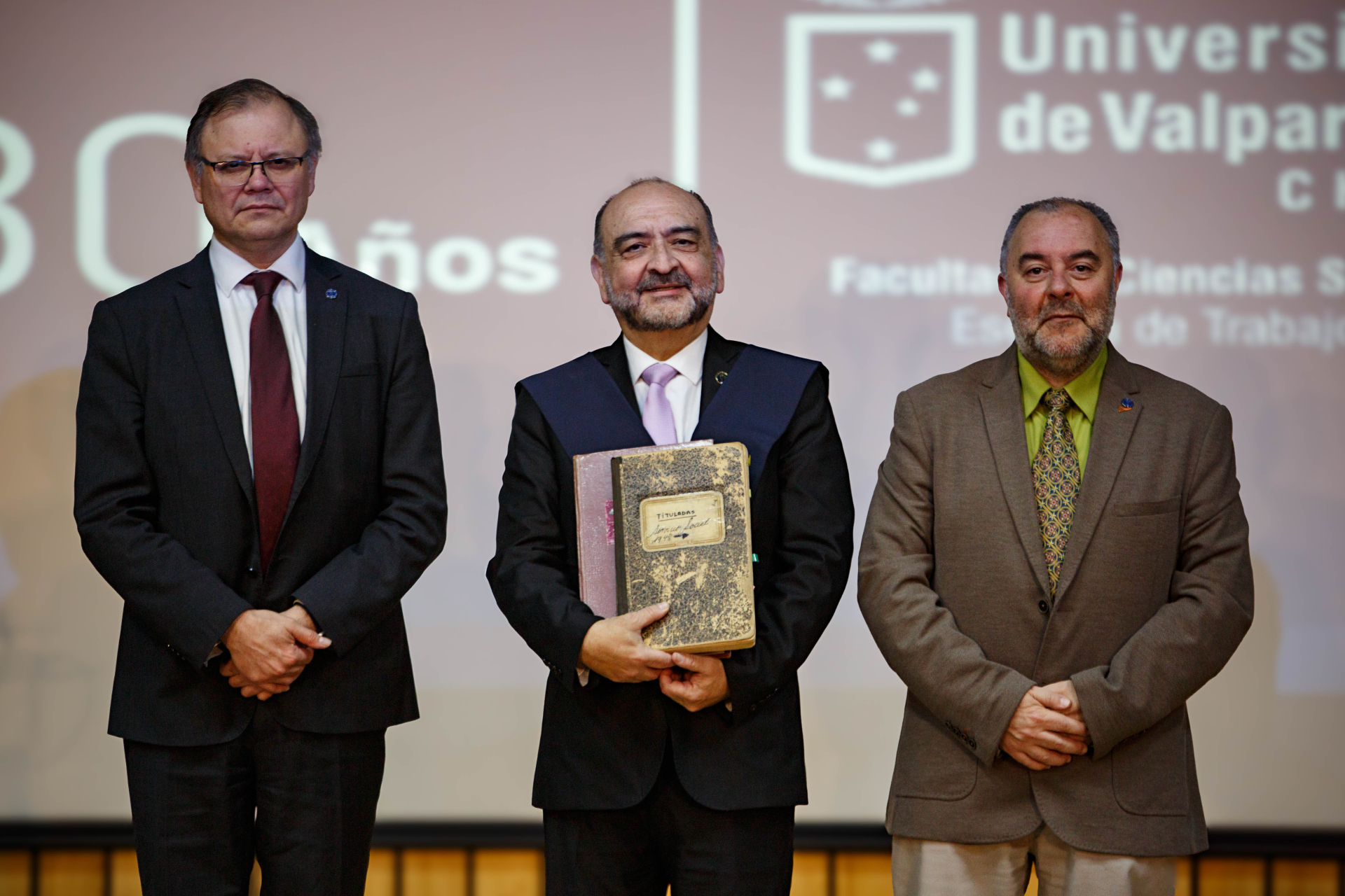 Como una manera de rendir un reconocimiento especial a la Escuela por sus ocho décadas, el decano y la vicedecana de la Facultad de Ciencias Sociales, Gonzalo Lira y Cecilia Concha, respectivamente, hicieron entrega al director Mauricio Ureta de los registros históricos de los exámenes de título presentados por todos los estudiantes que egresaron de la carrera de Trabajo Social desde 1945 hasta hoy. En ellos figuran los nombres de sus autores, el título de cada trabajo y la nota obtenida.