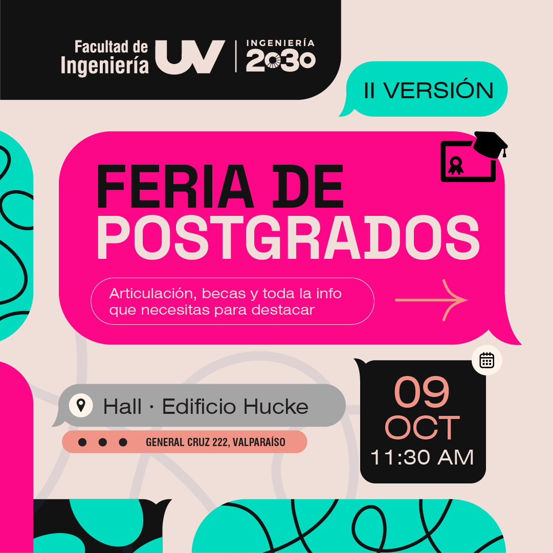 Acercar a estudiantes, egresadas, egresados, académicos, académicas, investigadores e investigadoras a los programas de doctorado, magíster y diplomados es el objetivo de la Segunda Feria de Postgrados de la Facultad de Ingeniería UV, que se realizará el miércoles 9 de octubre, a las 11:30 horas, en su sede ubicada en General Cruz 222, Valparaíso.