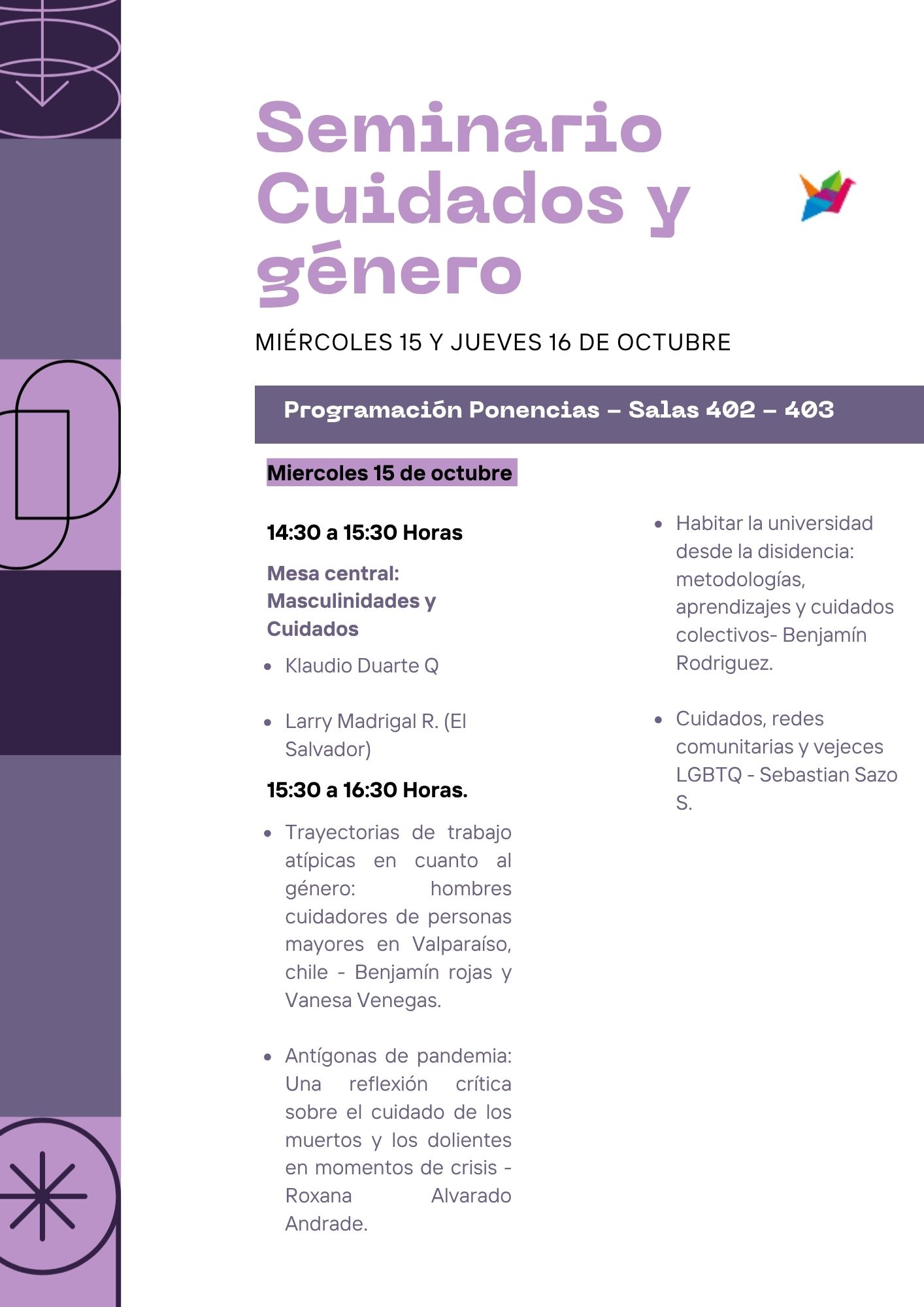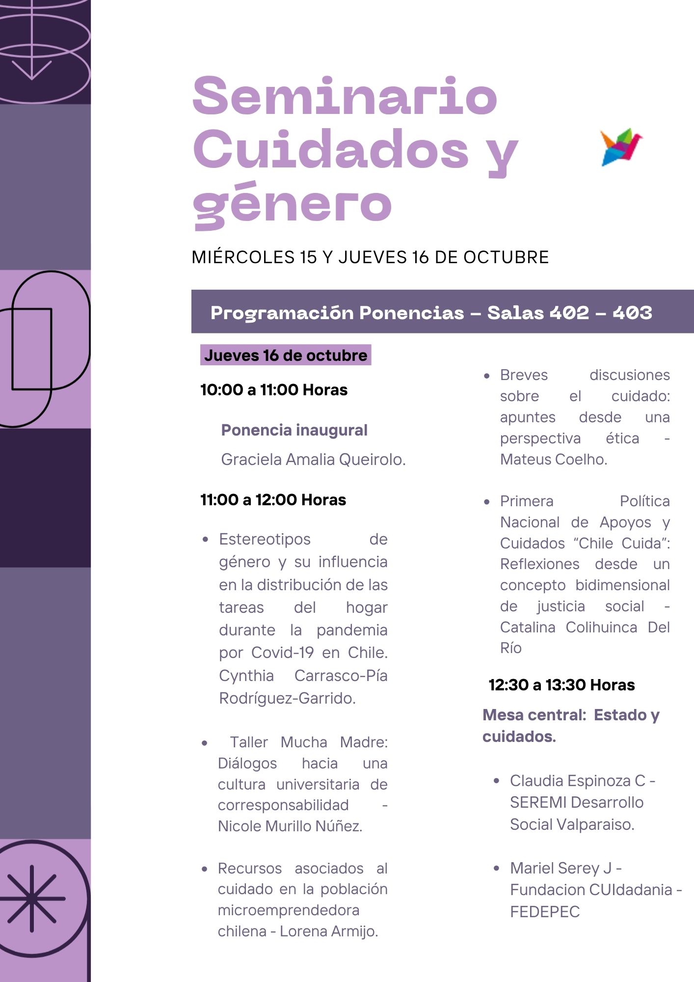 El seminario tendrá lugar en el CIAE UV, ubicado en Blanco 1931, Valparaíso, de 09:00 a 18:30 el miércoles y de 09:00 a 14:00 el jueves. Reunirá a académicos, académicas, investigadoras, investigadores, activistas y representantes de distintos sectores, promoviendo un intercambio de ideas y análisis que contribuya a fortalecer la participación activa en las políticas de cuidado y a promover la justicia social y la democracia.