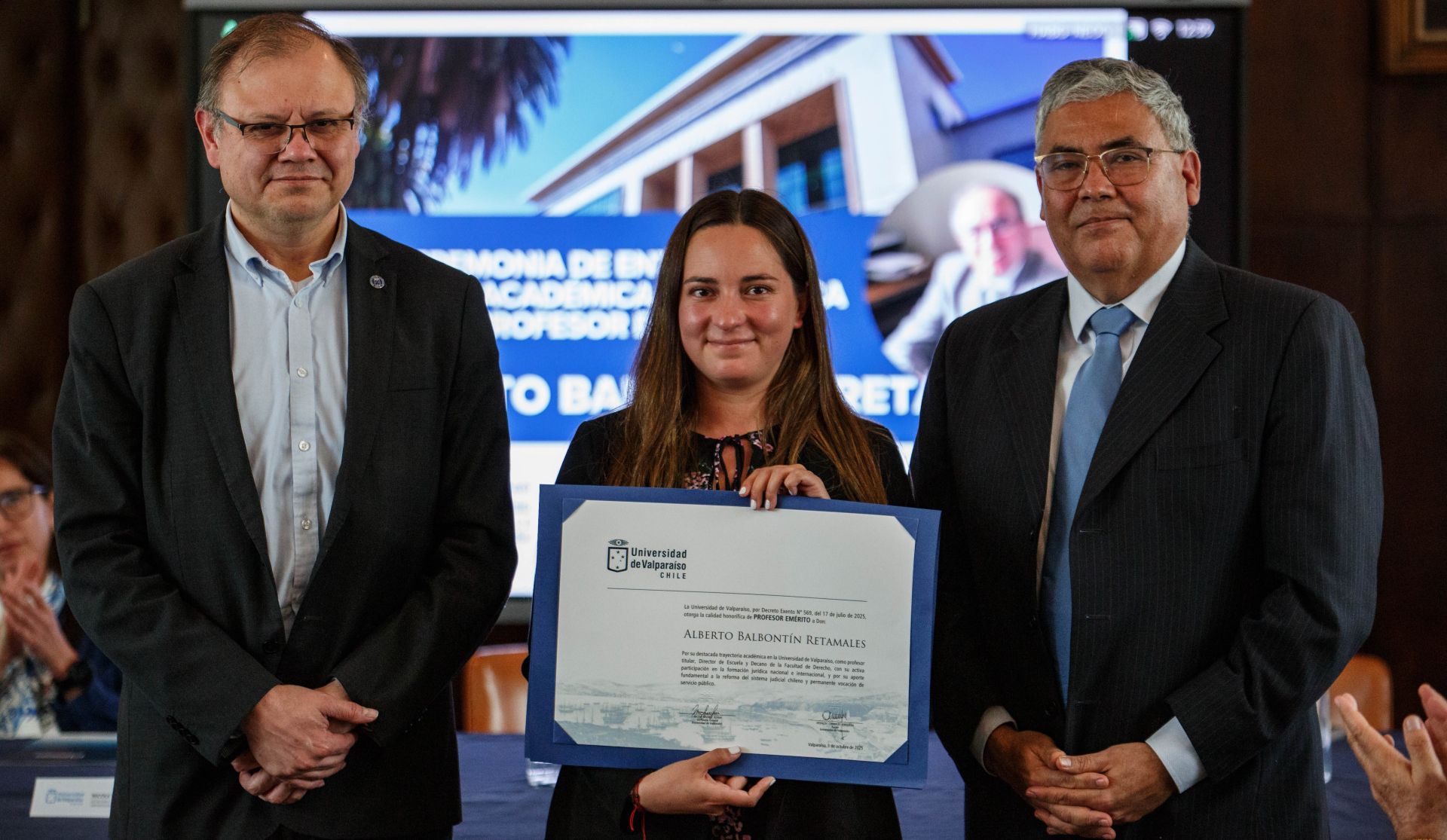 El diploma con el que se concedió la calidad académica honorífica de profesor emérito fue entregado por el rector Osvaldo Corrales y el decano Ricardo Saavedra a Constanza Balbontín, hija de Alberto Balbontín, en atención a que el exprofesor no puso asistir a la jornada.