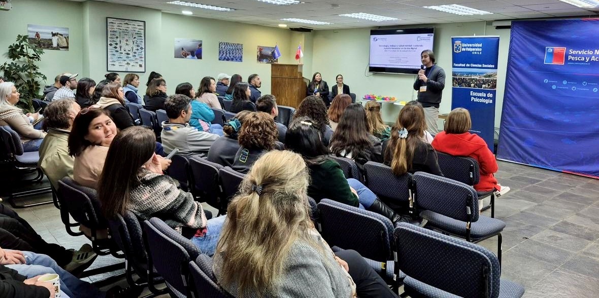 La actividad fue encabezada por Matías Bustillos Contreras, académico de la Escuela de Psicología de la Universidad de Valparaíso, quien presentó la ponencia “Tecnología, trabajo y salud mental: cuidando nuestro bienestar en la era digital”. La invitación fue gestionada por Scarlett Lobos y Daniela Galaz, psicólogas de la Unidad de Calidad de Vida, Equidad de Género y Prevención de Riesgos de Sernapesca, y también tituladas de la Escuela.