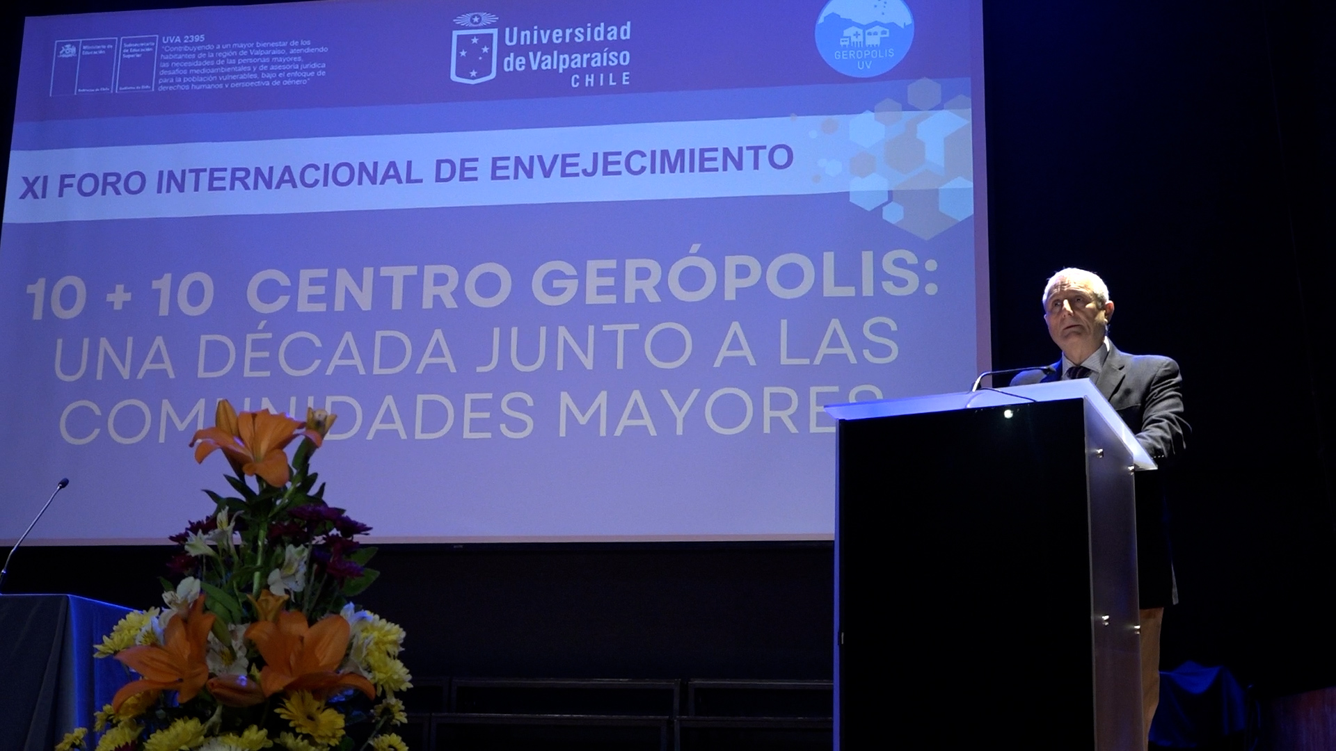 El foro comenzó con las palabras de saludo del rector de la UV, Osvaldo Corrales, tras lo cual el ministro de Ciencia, Tecnología, Conocimiento e Innovación, Aldo Valle, expuso sobre el rol de la academia en los desafíos del país asociados al envejecimiento, la innovación, la investigación y el desarrollo. Valle era rector de la UV cuando nació Gerópolis, por lo que su intervención incluyó sus propios recuerdos sobre la creación del Centro.