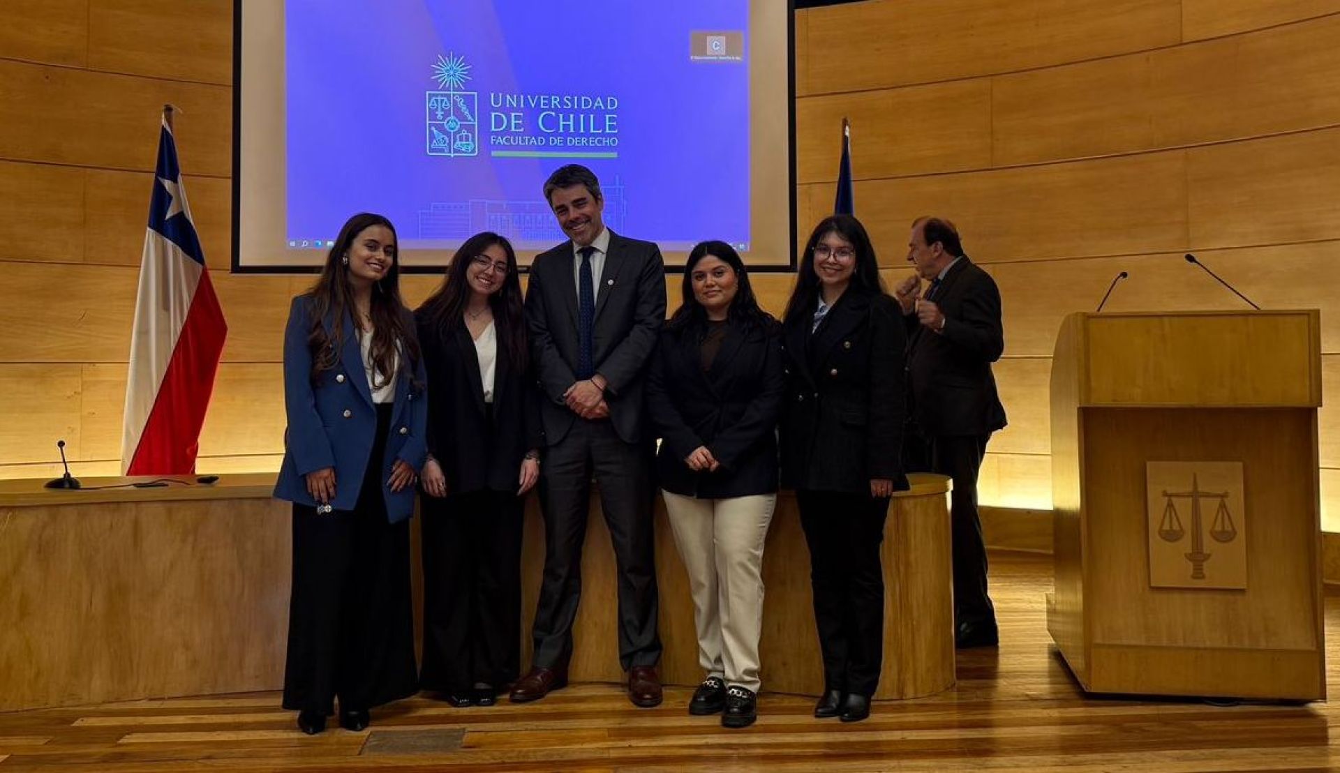 El académico Matías Rodríguez, la egresada Leslie Moya y las estudiantes Antonia Cabezas, Constanza Farías y María Paz Carriel, fueron parte del evento llevado a cabo en la Universidad de Chile.