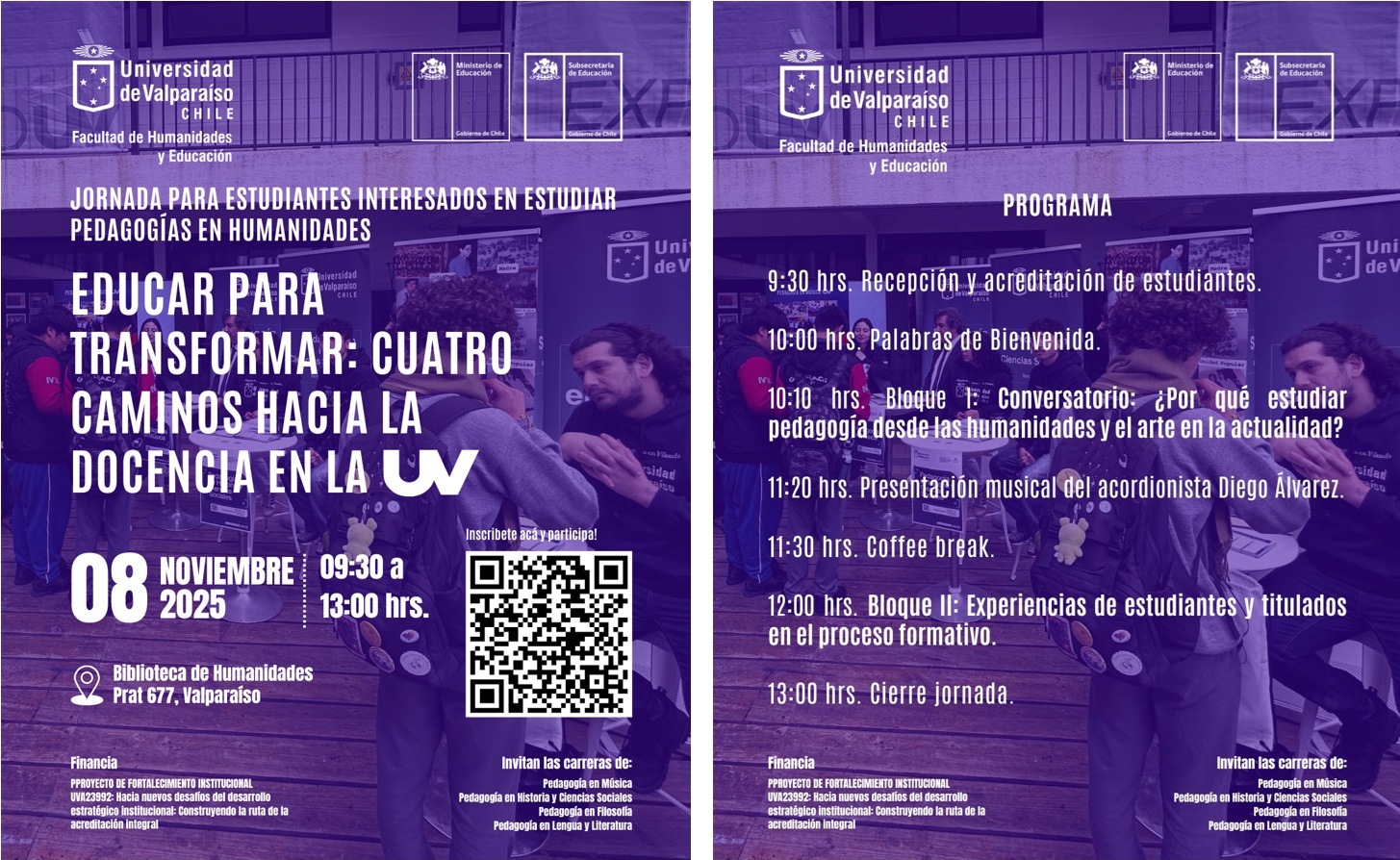Una jornada de orientación vocacional dirigida a estudiantes de tercero y cuarto medio y egresadas y egresados interesados en estudiar Pedagogía en Historia y Ciencias Sociales, Pedagogía en Música, Pedagogía en Filosofía o Pedagogía en Lengua y Literatura en la Universidad de Valparaíso, realizará la Facultad de Humanidades y Educación en conjunto con la Unidad de Admisión y Promoción de la Vicerrectoría Académica de la Universidad de Valparaíso este sábado 8 de noviembre, entre las 09:30 y las 13:00 horas, en la Biblioteca de Humanidades, ubicada en Prat 677, Valparaíso.
