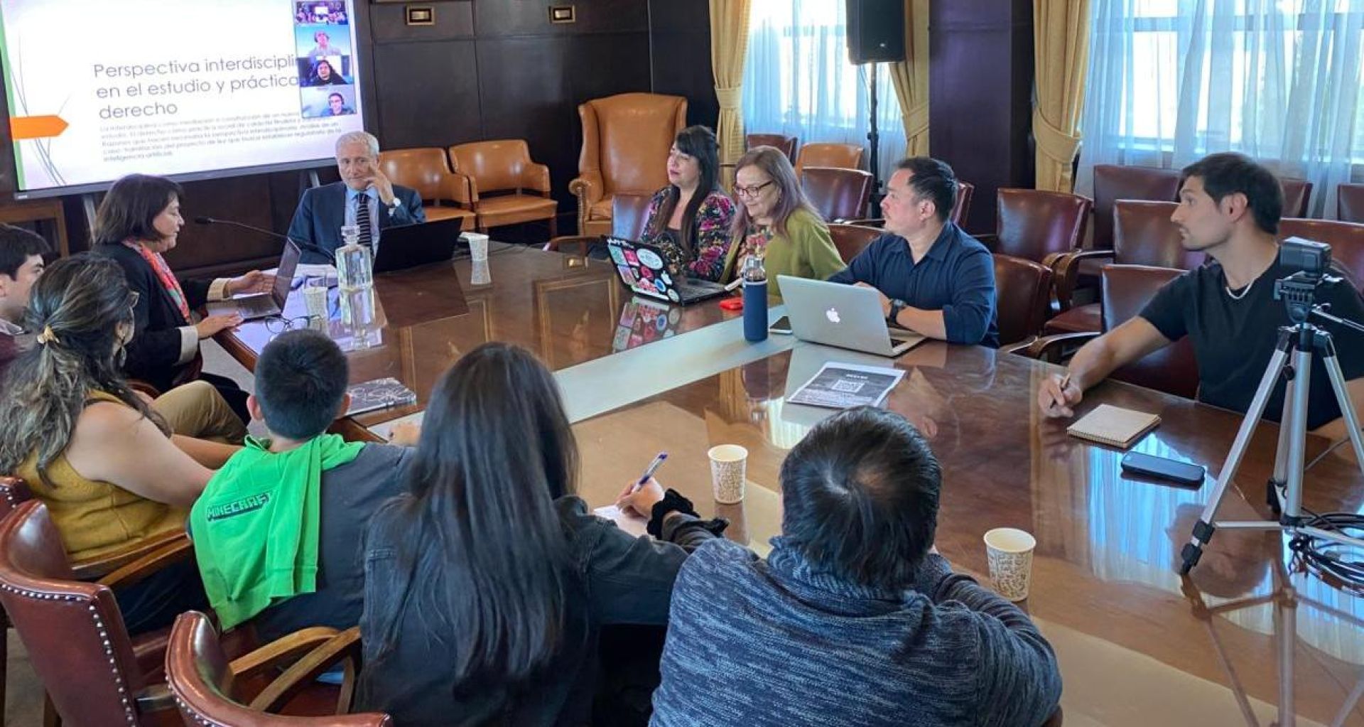 Para ejemplificar los contenidos indicados, el profesor Aldo Valle hizo referencia al proyecto de ley que se está tramitando en el Congreso sobre Inteligencia Artificial, explicando la manera en que allí concurren distintas miradas y perspectivas acerca de un fenómeno jurídico, como lo es la creación de una ley.