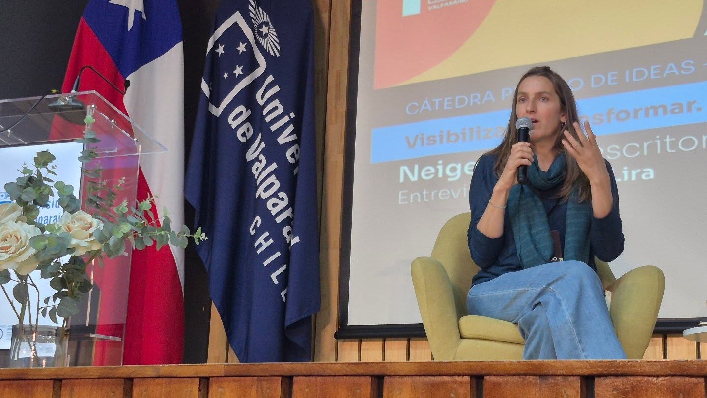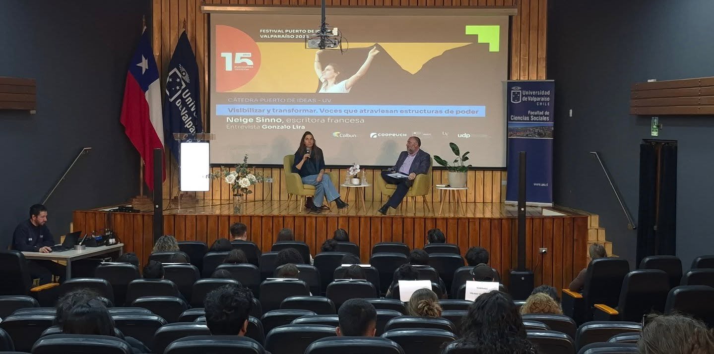 En el auditorio de la Facultad de Ciencias Sociales de la UV la escritora francesa Neige Sinno dictó la cátedra “Visibilizar y transformar. Voces que atraviesan estructuras de poder”, en la forma de una conversación que sostuvo con el decano de la FACSO, el psicólogo y académico Gonzalo Lira.