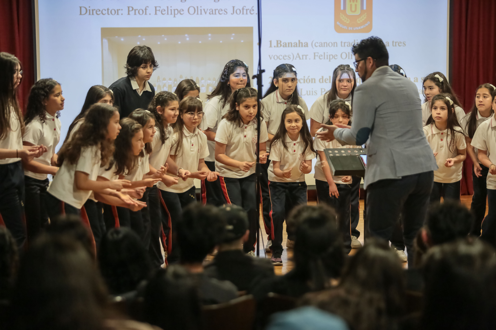 El Coro del Colegio Miguel de Unamuno, conformado por niñas y niños de siete a trece años, formado y dirigido por su profesor Felipe Olivares, interpretó: “Banaha” (canon tradicional a tres voces); “Canción del bebé que le cuenta a su mamá”, de Luis Pescetti, y “He Lives in You”, de Lebo M. Arreglos de Felipe Olivares.