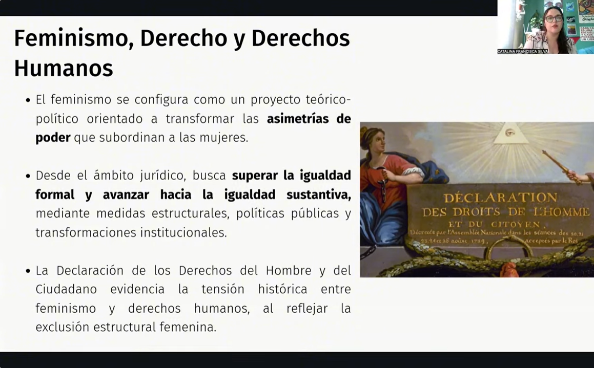 En la oportunidad, la alumna de la UV presentó —en modalidad online— la ponencia “Feminismo y derechos humanos: tensiones y desafíos del modelo chileno”, instancia en que realizó un análisis del feminismo en Chile desde una perspectiva político-jurídica y social, abordando su evolución y relación con los derechos humanos y reflexionando sobre la transición desde la igualdad formal hacia la igualdad sustantiva, y el papel transformador del Derecho.