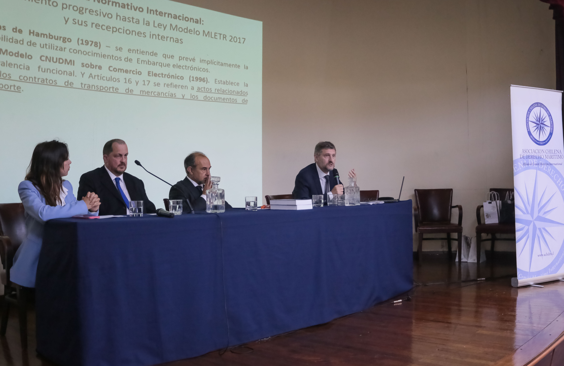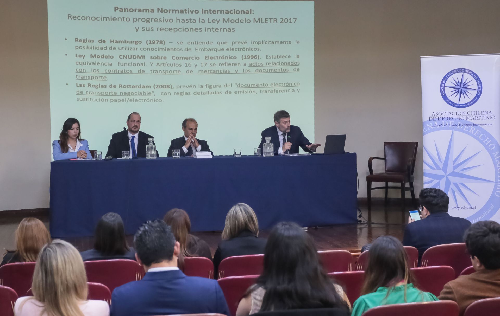 En la oportunidad, se dieron cita especialistas en la materia, en una actividad que tuvo por objetivo analizar los desafíos normativos, prácticos y tecnológicos que plantea la implementación del conocimiento de embarque electrónico (e-BL) en el contexto del Derecho Marítimo Chileno, a la luz de los desarrollos internacionales recientes.